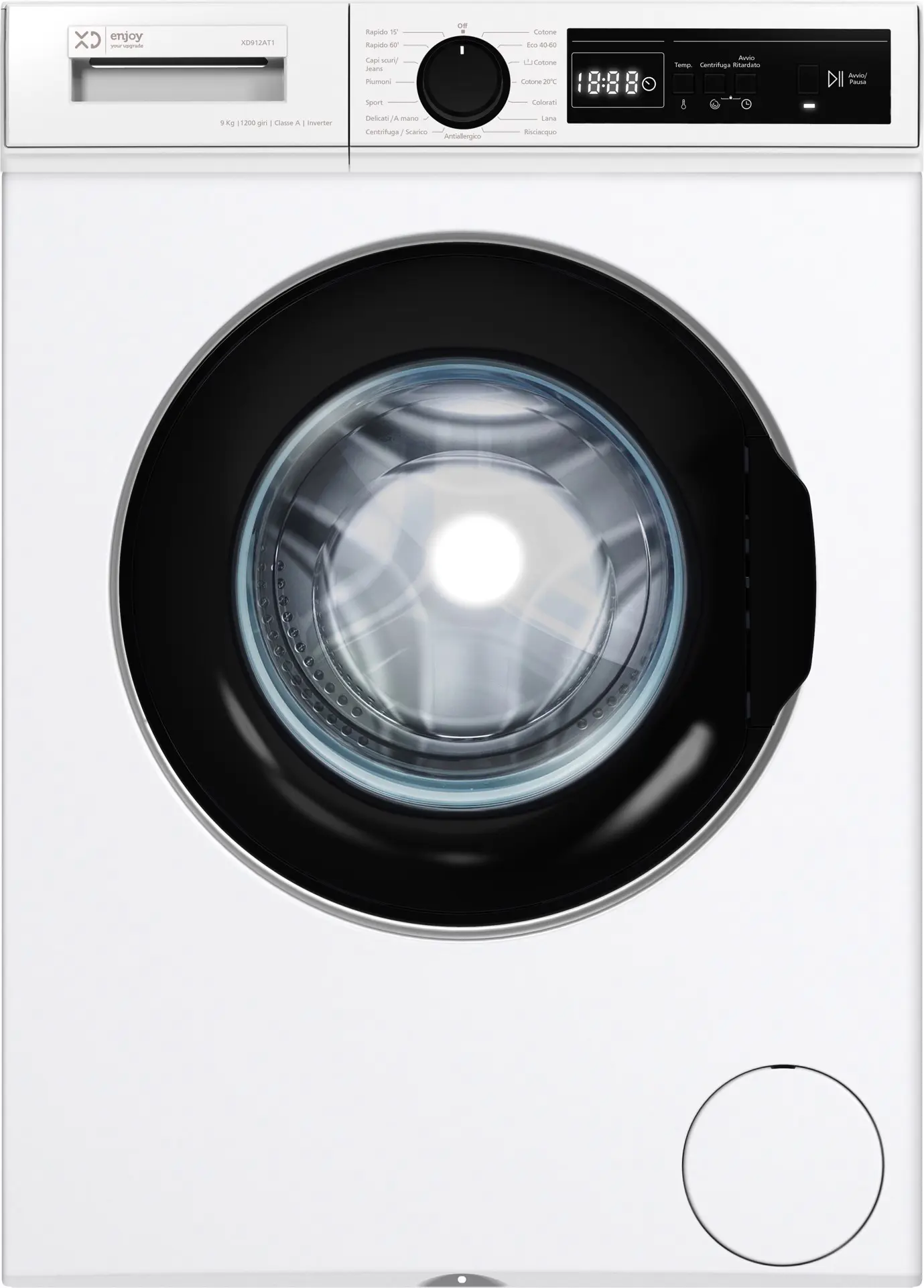 XD Enjoy Lavatrice 9 kg 1200 giri/min Inverter. Tipo di carica: Caricamento frontale. Capacità cestello: 9 kg, Classe di efficienza della centrifuga: B, Silenziosità (centrifuga): 76 dB, Velocità di centrifuga massima: 1200 Giri/min. Colore del prodotto: Bianco. Larghezza: 600 mm, Profondità: 580 mm, Altezza: 850 mm. Classe efficienza energetica: A