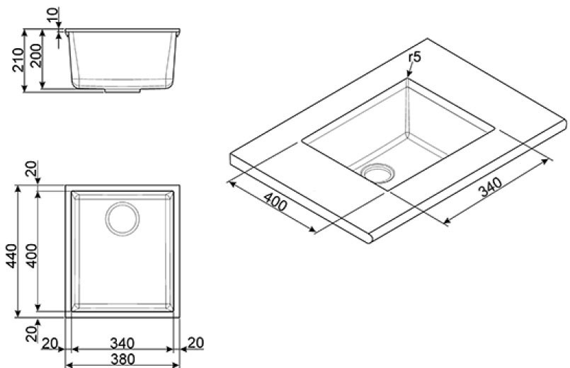 Dimensioni prima vasca (LxL): 340 x 400 mm