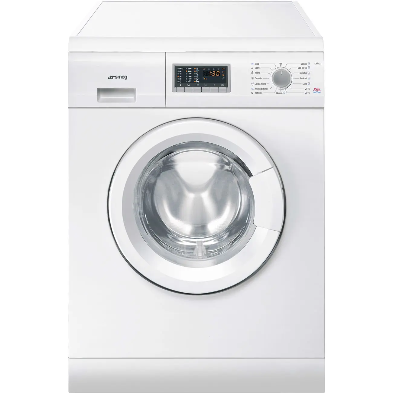 Smeg LBF127. Tipo di carica: Caricamento frontale. Capacità cestello: 7 kg, Classe di efficienza della centrifuga: C, Silenziosità (centrifuga): 72 dB, Velocità di centrifuga massima: 1200 Giri/min. Colore del prodotto: Bianco. Larghezza: 600 mm, Profondità: 550 mm, Altezza: 850 mm. Classe efficienza energetica: E