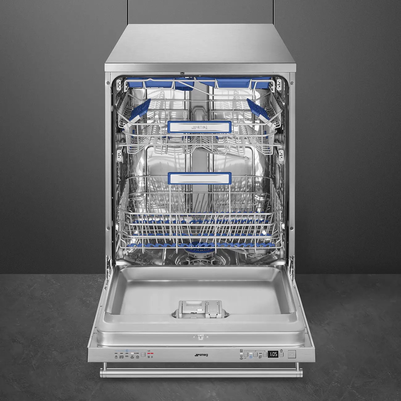 Smeg LVS433STPXIN. Posizionamento dell'apparecchio: Libera installazione, Dimensione: Dimensione massima (60 cm), Colore della porta: Acciaio inossidabile. Numero di coperti: 13 coperti, Classe emissione rumore: B, Emissione acustica: 44 dB. Classe efficienza energetica: D, Consumo di acqua per ciclo: 9 L, Consumo energetico per 100 cicli: 81 kWh. Larghezza: 598 mm, Profondità: 600 mm, Altezza: 848 mm