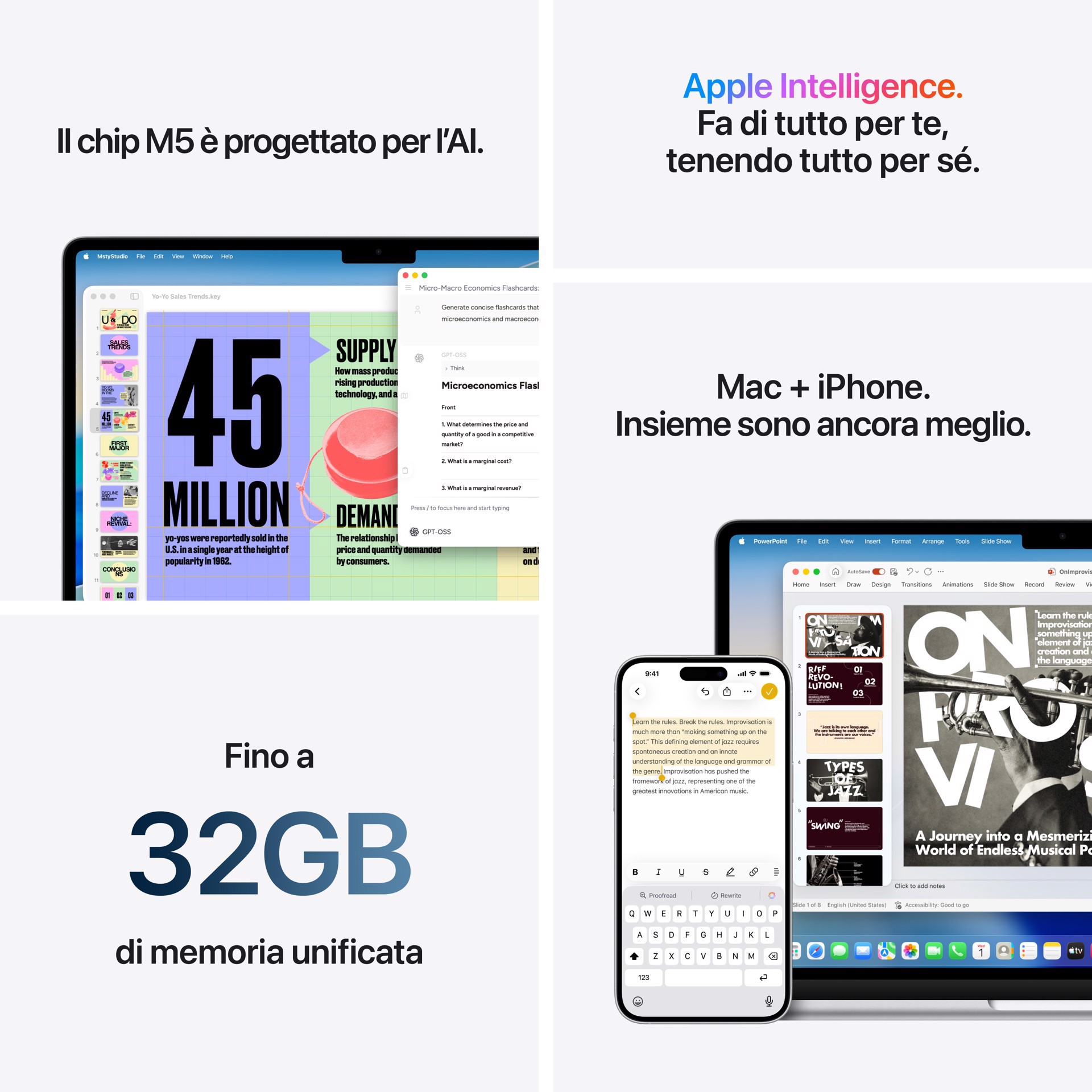 | Caratteristiche di accessibilità | VoiceOver, Zoom, Controllo vocale, Switch Control, Sottotitolati, Live Captions, Accessibility Reader, Live Speech, Motion & display and text settings, Personal Voice |