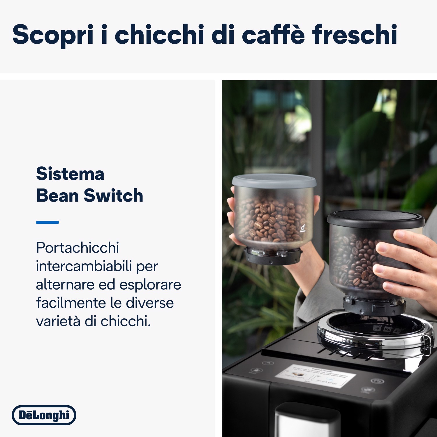 Bean Switch System ti consente di esplorare nuove varietà di chicchi. Rivelia è dotata di due portachicchi intercambiabili da 250 g per farti gustare diverse varietà di caffè. Per prepararti a cambiare, utilizza prima la modalità Switch per svuotare il macinino dai chicchi presenti, scegliendo se preparare un caffè o macinarli.