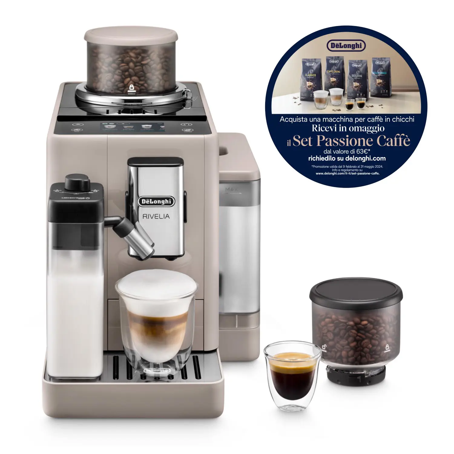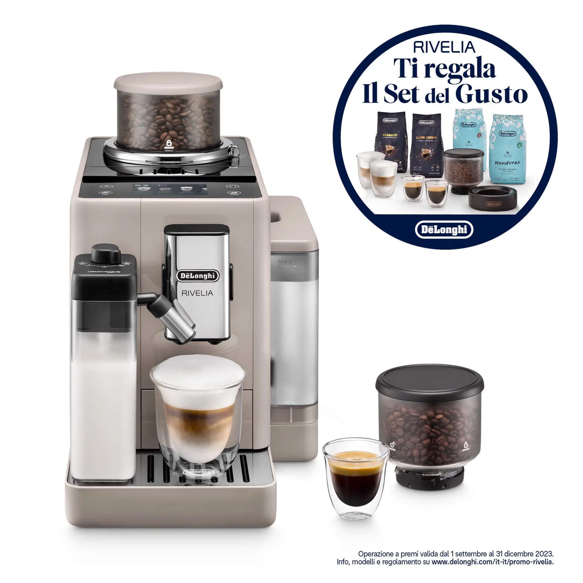 Tuffati nel mondo del caffè con Rivelia. Esplora infinite varietà di chicchi con Bean Switch System, vivi un’esperienza immersiva con un display a colori full-touch da 3,5”, con ricche animazioni e la funzione Coffee Routines, su misura per te. Completa le tue bevande a base di latte con una schiuma pregiata grazie alla tecnologia LatteCrema Hot, in una macchina compatta che si adatta al tuo stile.