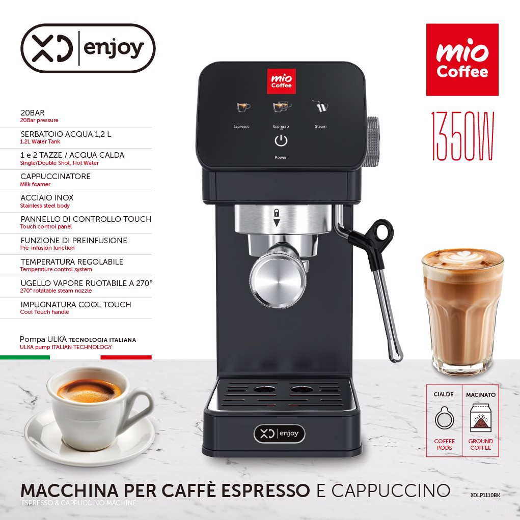 XD Enjoy XDLP1110BK. Tipo di prodotto: Macchina per espresso, Tipologia macchina del caffé: Automatica/Manuale, Capacità tanica acqua: 1,2 L, Tipologia di caffè utilizzato: Cialde caffè, Caffè macinato, Vaschetta per caffè preparato: Tazza, Capacità in tazze: 1 tazze. Potenza: 1350 W. Colore del prodotto: Nero