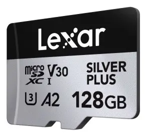 Lexar Professional SILVER PLUS. Capacità: 128 GB, Tipo flash card: MicroSDXC, Tipo di RAM: UHS-I, Velocità di lettura: 205 MB/s, Velocità di scrittura: 150 MB/s, Classe di velocità UHS: Class 3 (U3), Classe di velocità video: V30. Funzioni di protezione: Resistente alle cadute, Resistente agli urti, A prova di magnete, Resistente agli urti, A prova di..., Colore del prodotto: Nero, Argento