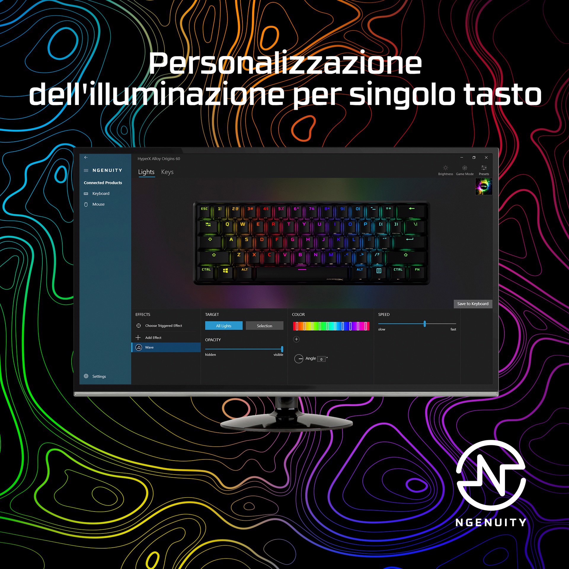 La tastiera HyperX Alloy Origins™ 60 ha un ingombro ridotto al 60% che la rende estremamente comoda da trasportare e lascia più spazio ai movimenti del mouse. È dotata di un robusto corpo completamente d'alluminio, mentre gli switch HyperX di cui è dotata sono bilanciati per assicurare velocità e reattività e possono resistere a 80 milioni di pressioni. Sui copritasti Double Shot PBT in dotazione è stampata anche una seconda funzione, così potrai individuare più rapidamente le funzionalità aggiuntive. Il design con LED a vista degli switch HyperX e gli straordinari effetti luminosi permettono al tuo stile di trasparire in tutto il suo splendore. Personalizza ulteriormente la tastiera con macro, profili di illuminazione e tanto altro ancora con il software NGENUITY di HyperX.[3]