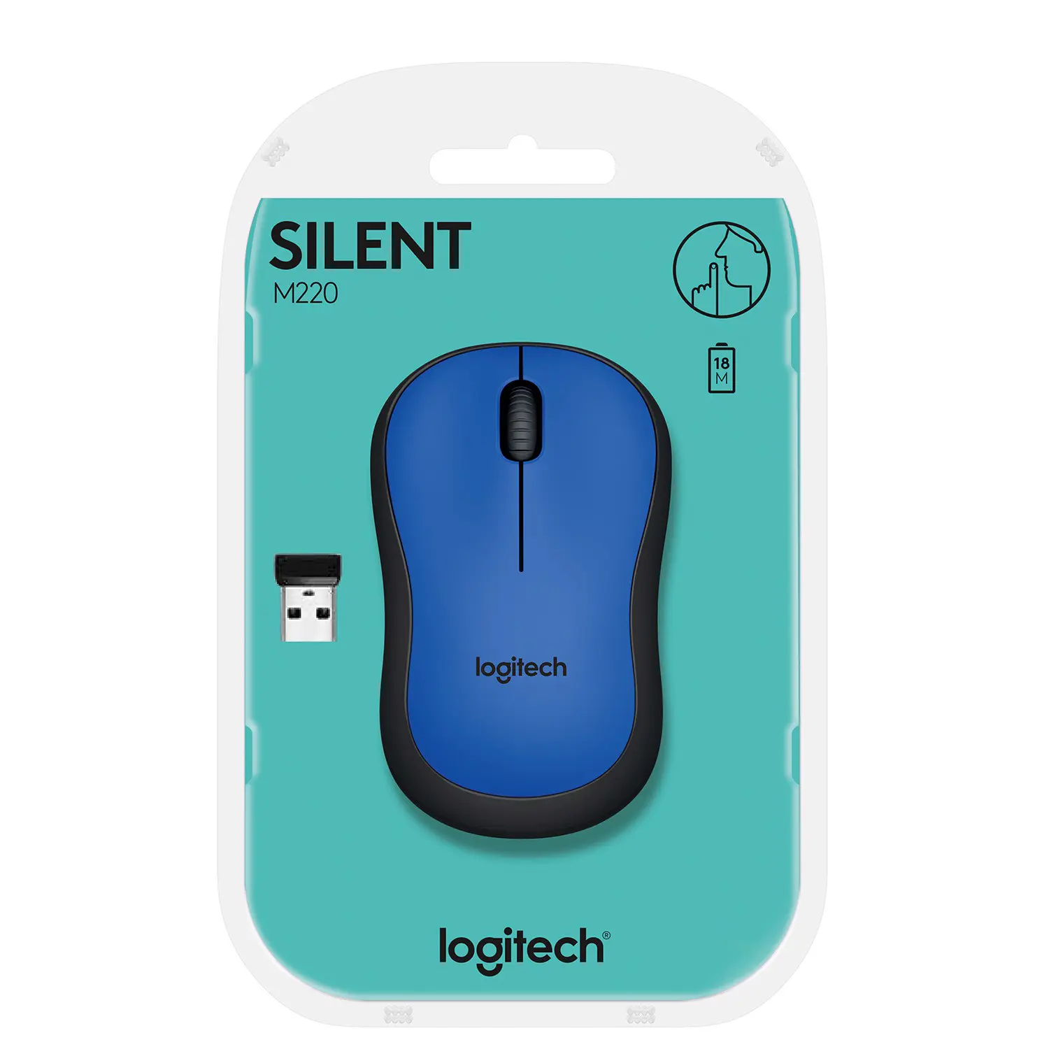 Logitech M220 SILENT. Fattore di forma: Ambidestro. Tecnologia di rilevamento del movimento: Ottico, Interfaccia dispositivo: RF Wireless, Risoluzione movimento: 1000 DPI, Tipo di pulsanti: Tasti premuti, Numero di tasti: 3, Tipo di scorimmento: Rotella. Alimentazione: Batterie. Colore del prodotto: Nero, Blu