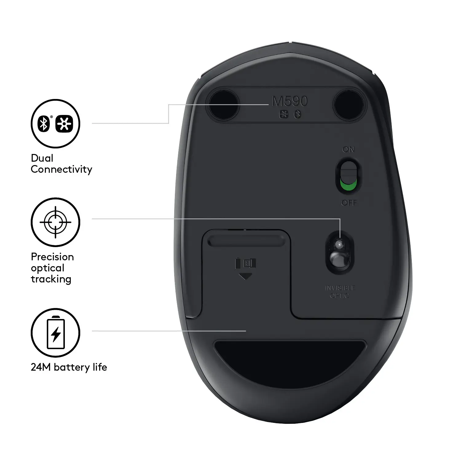 Logitech M590, Mano destra, Ottico, Wireless a RF + Bluetooth, 1000 DPI, Grafite