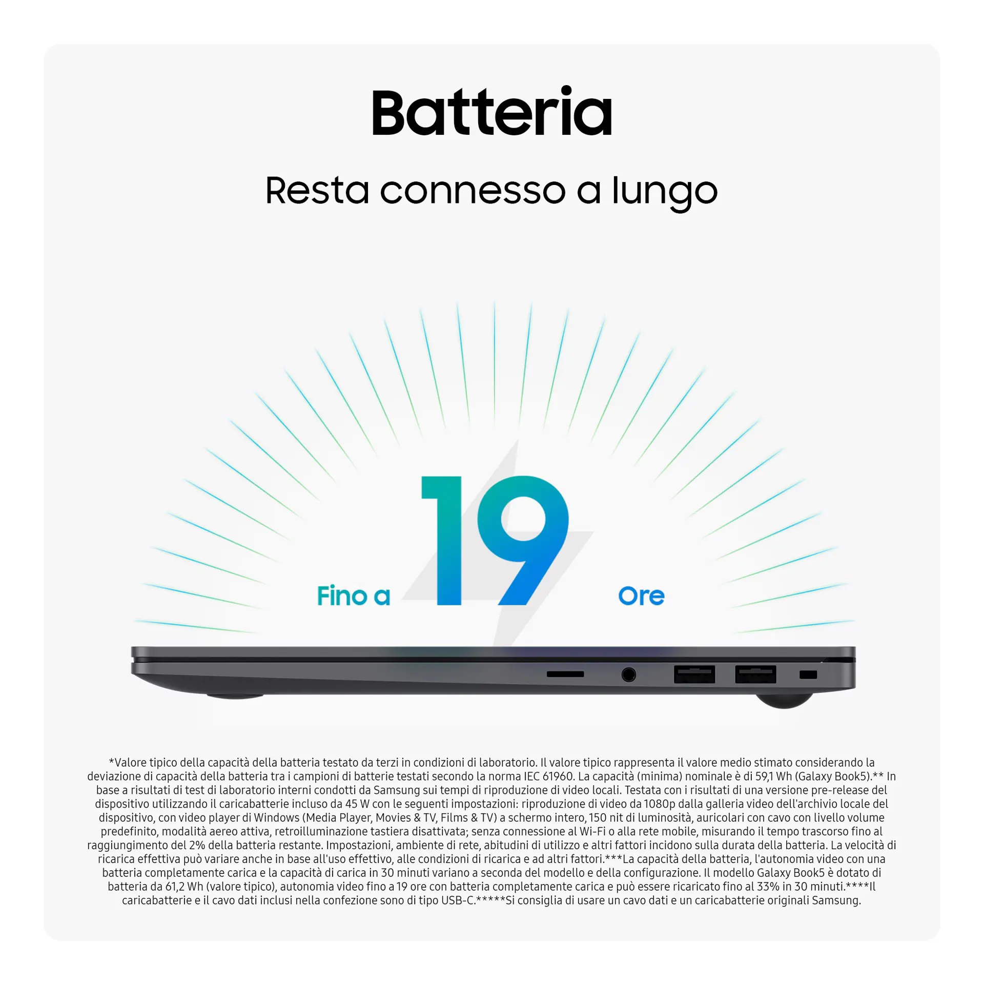 La produttività è assicurata: con una sola ricarica della batteria di Galaxy Book5 avrai fino a 19 ore di autonomia video. Per ricaricarla, collega il caricabatterie compatto e raggiungi il 33% in soli 30 minuti con la ricarica rapida.