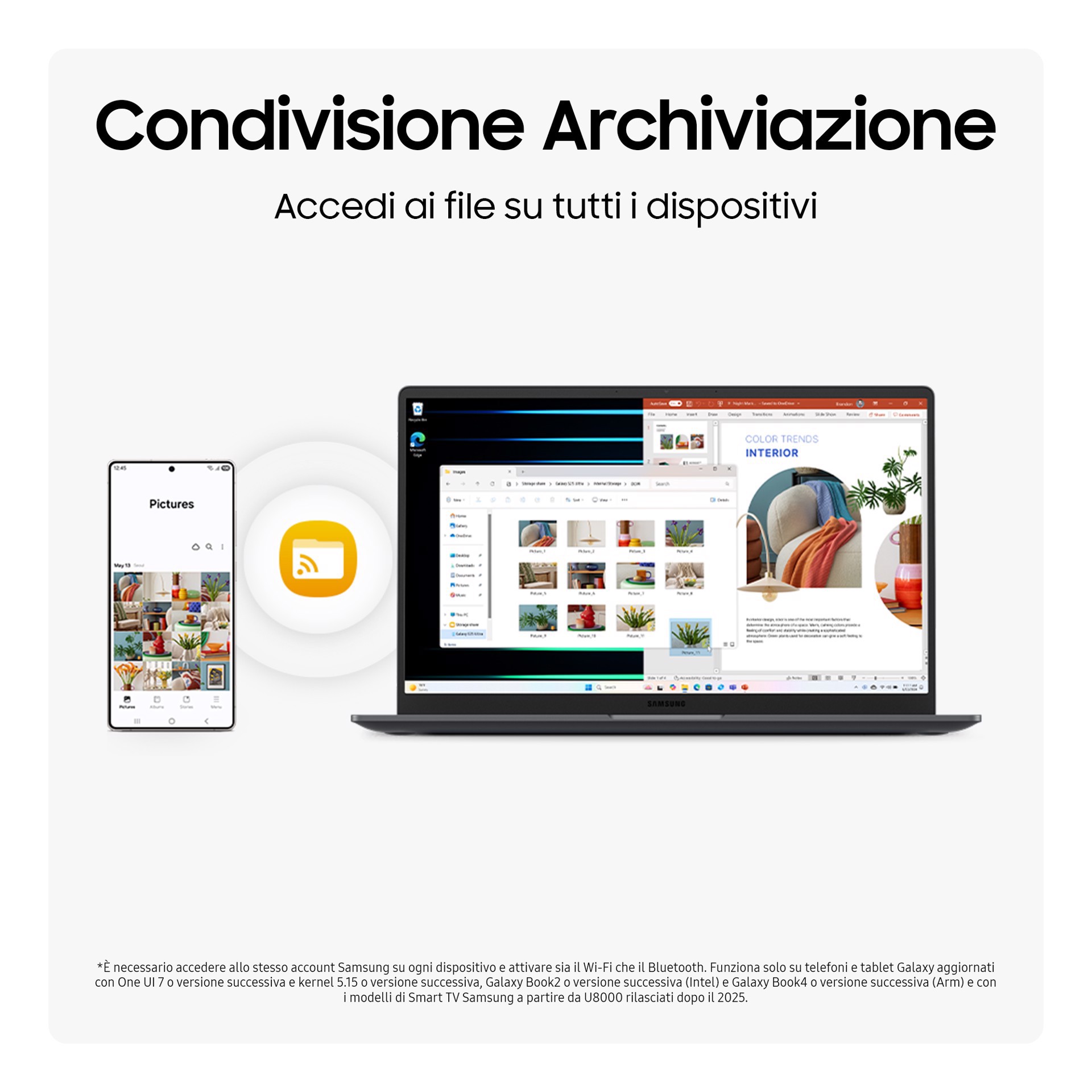 Con la funzione Nearby devices potrai collegare e utilizzare i dispositivi Galaxy in pochi istanti. Apri il menu di Galaxy Book5 per collegare i dispositivi con un semplice drag and drop, quindi avvia funzioni intuitive come Controllo Multiplo e Condivisione Archiviazione tra telefono, PC e Tab, tutto da un unico hub di connettività.