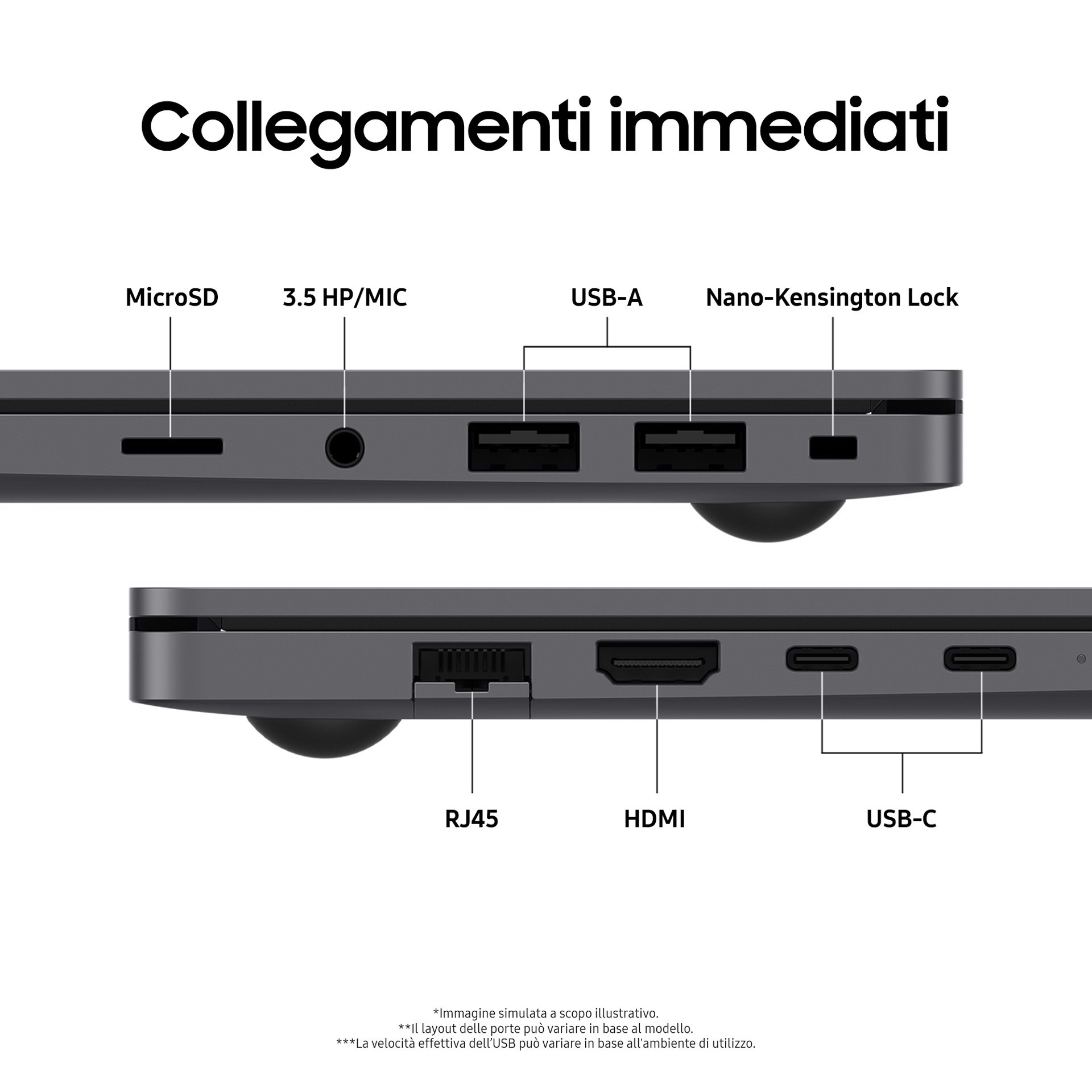 Galaxy Book5 è dotato di un'ampia serie di porte. Collega facilmente i dispositivi essenziali alla tuo notebook grazie a una serie di porte integrate, tra cui una porta HDMI, due porte USB-A, due porte USB-C, uno slot microSD e perfino una porta RJ45 per una connessione LAN ad alta velocità.
