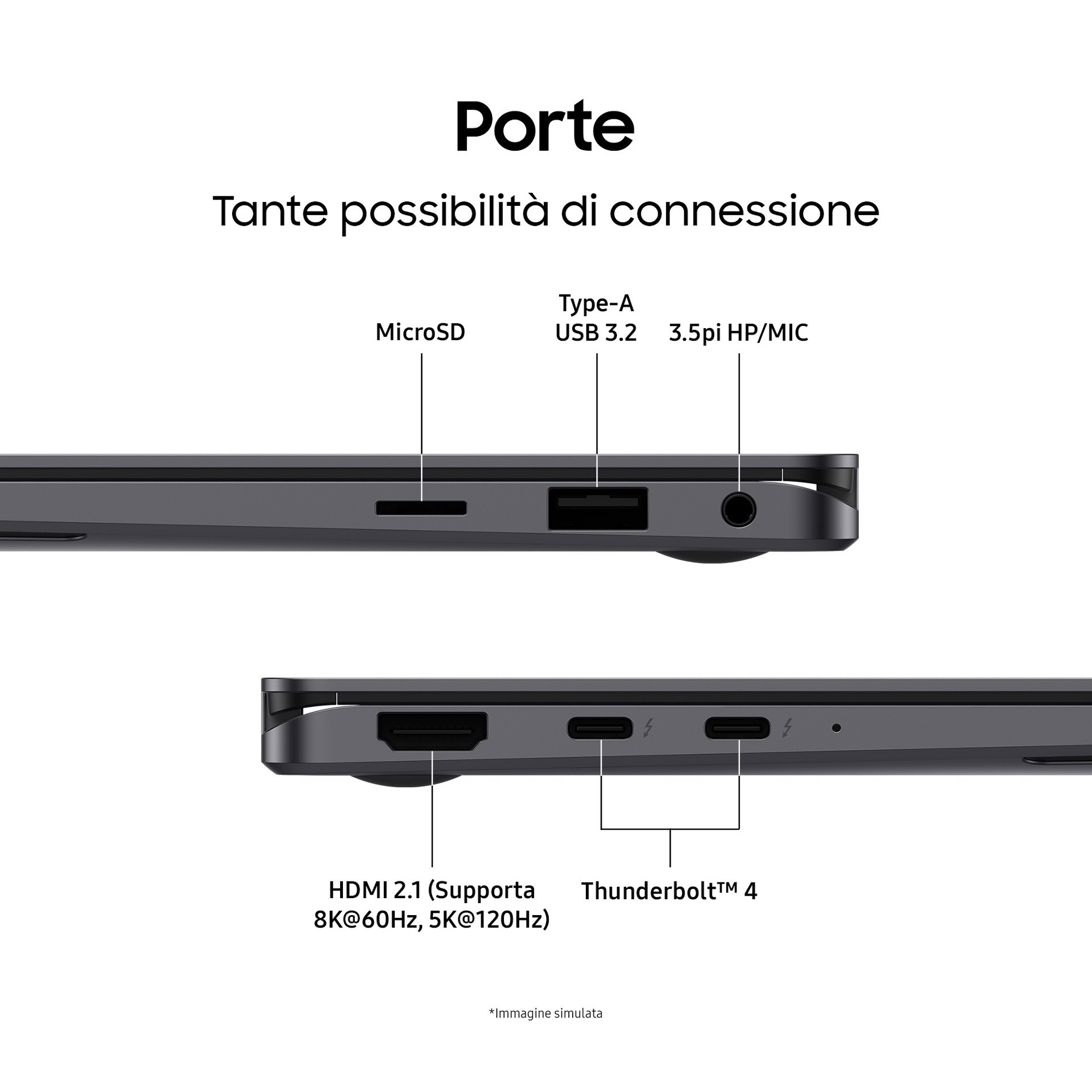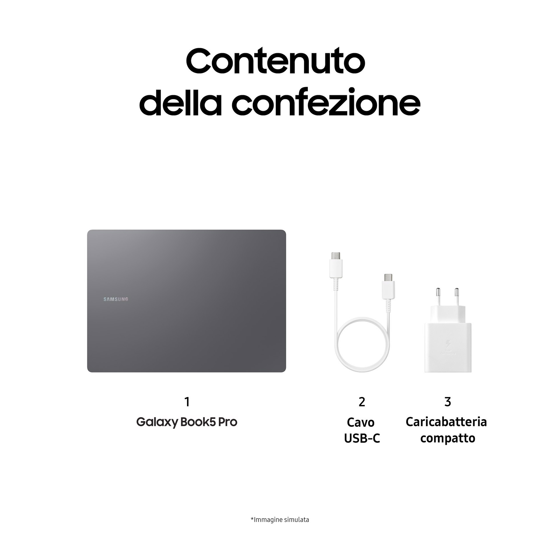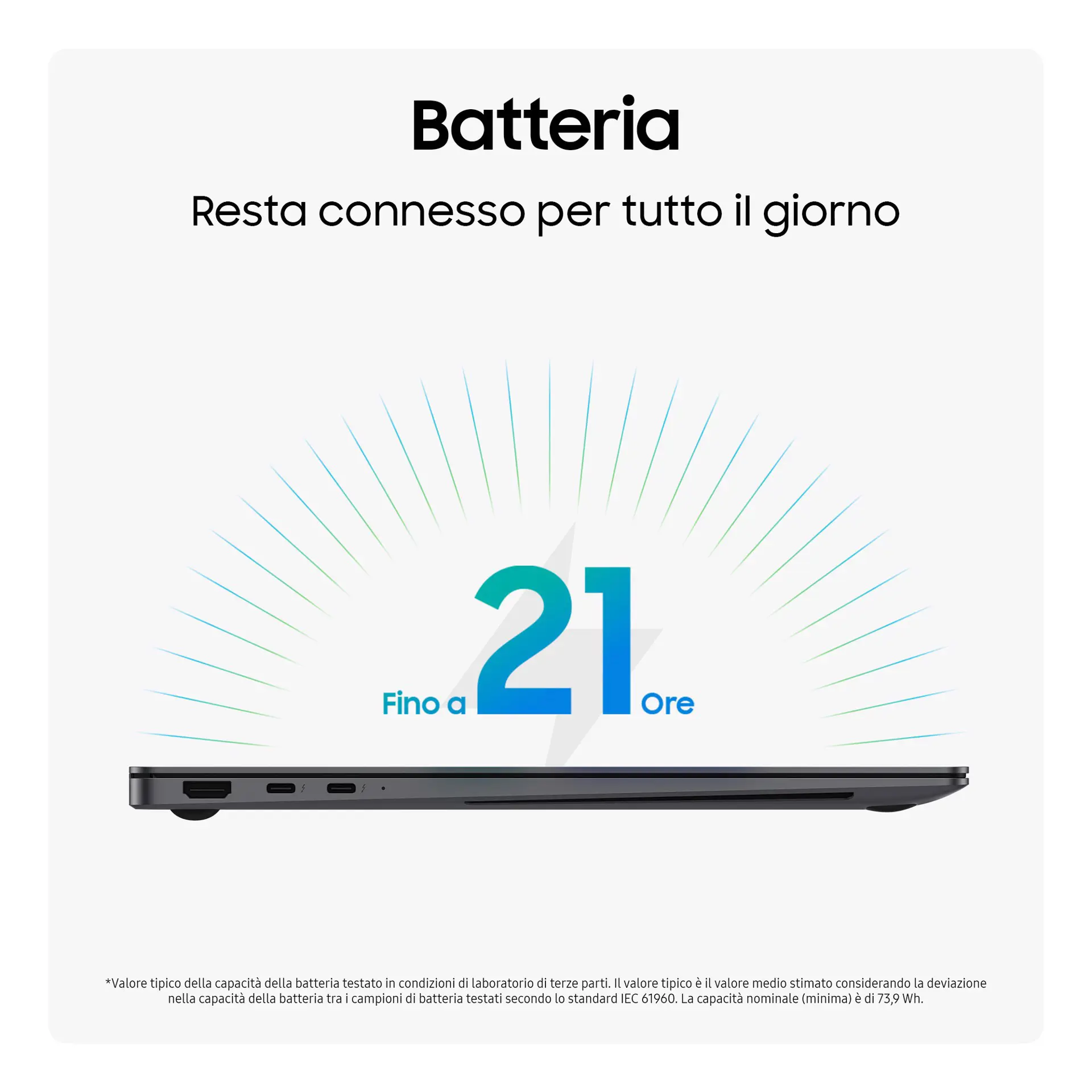 La produttività è assicurata: con una sola ricarica della batteria a lunga durata di Galaxy Book5 Pro 14" avrai fino a 21 ore di autonomia video. Per ricaricare, collega il caricabatterie compatto USB-C e raggiungi il 41% in soli 30 minuti con la ricarica rapida.