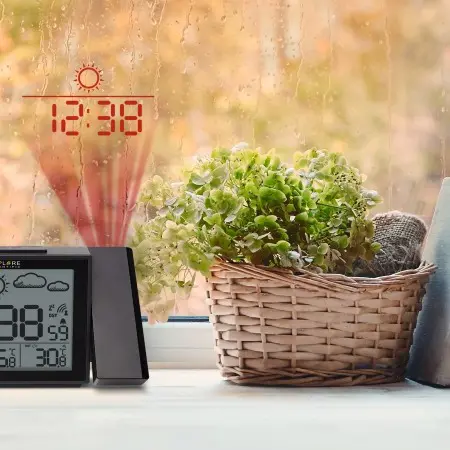 Mette insieme la comodità della proiezione dell’ora, a soffitto o a parete, con l’utilità delle previsioni del tempo che, grazie a grandi e chiare icone, sono sempre a vista. Il sensore esterno della temperatura è dotato di display per una consultazione rapida del valore termico anche quando si è distanti dall’unità principale.