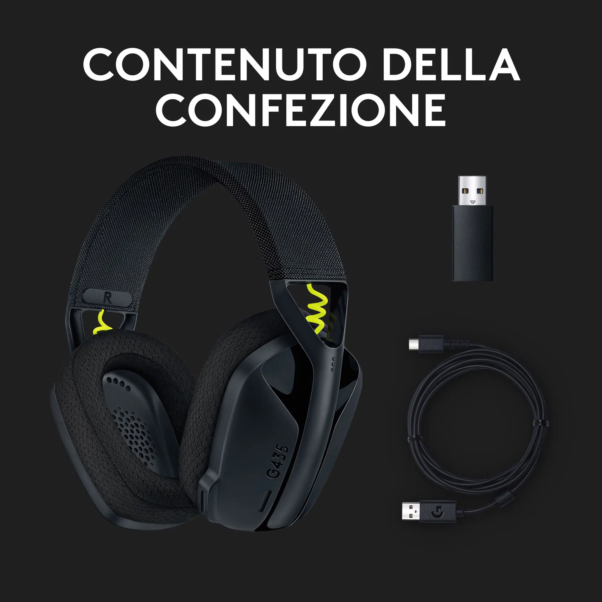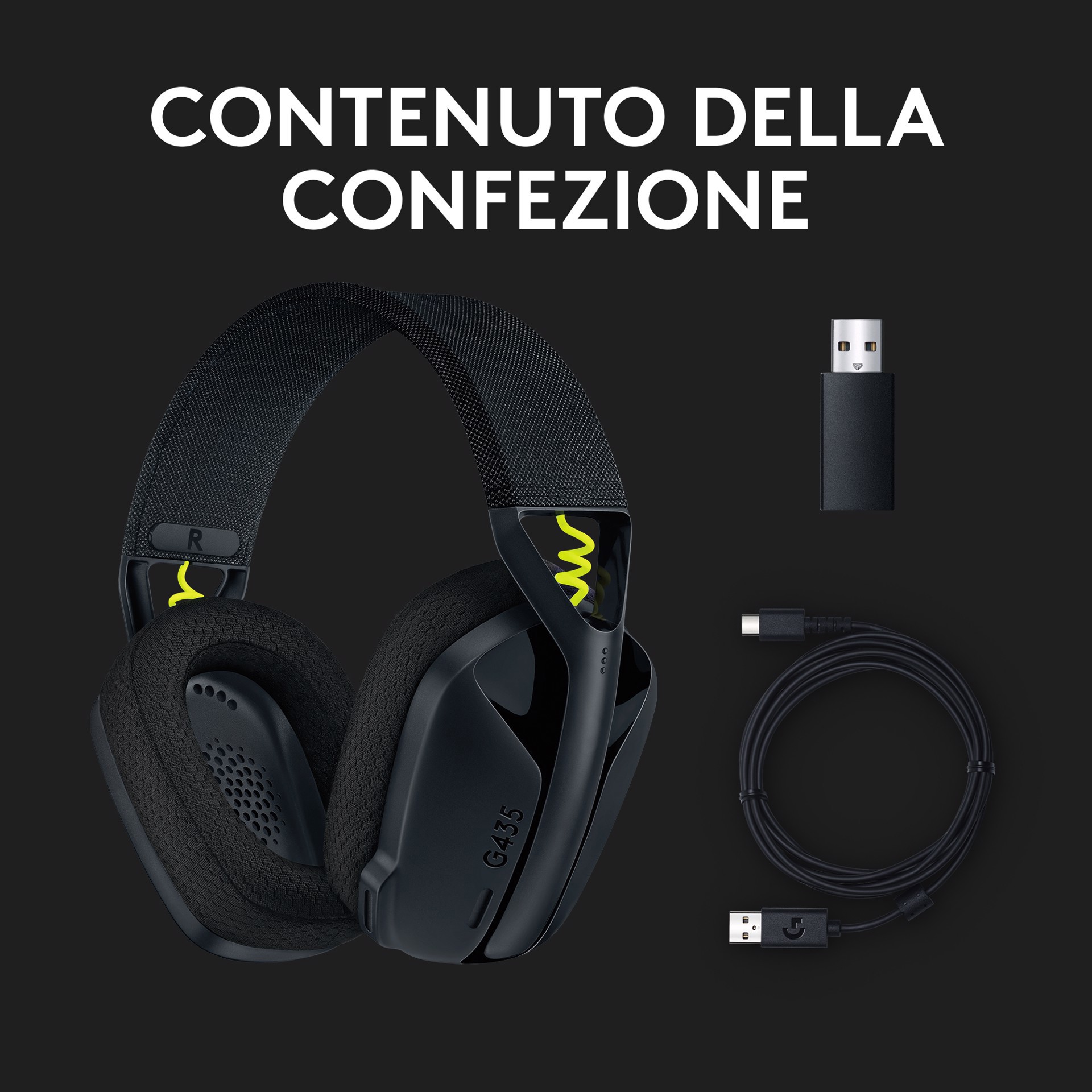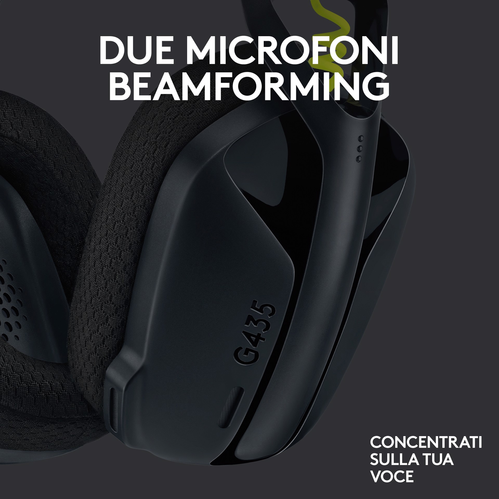 Gioca, riproduci musica e connettiti con gli amici. La cuffia con microfono per gaming G435 può essere collegata al PC, al telefono e ad altri dispositivi tramite tecnologia wireless LIGHTSPEED di livello gaming e Bluetooth®. La qualità audio è straordinaria e i microfoni beamforming riducono i rumori di fondo. Inoltre, è realizzata con almeno il 22% di plastica riciclata. Il divertimento non finisce mai con G435.