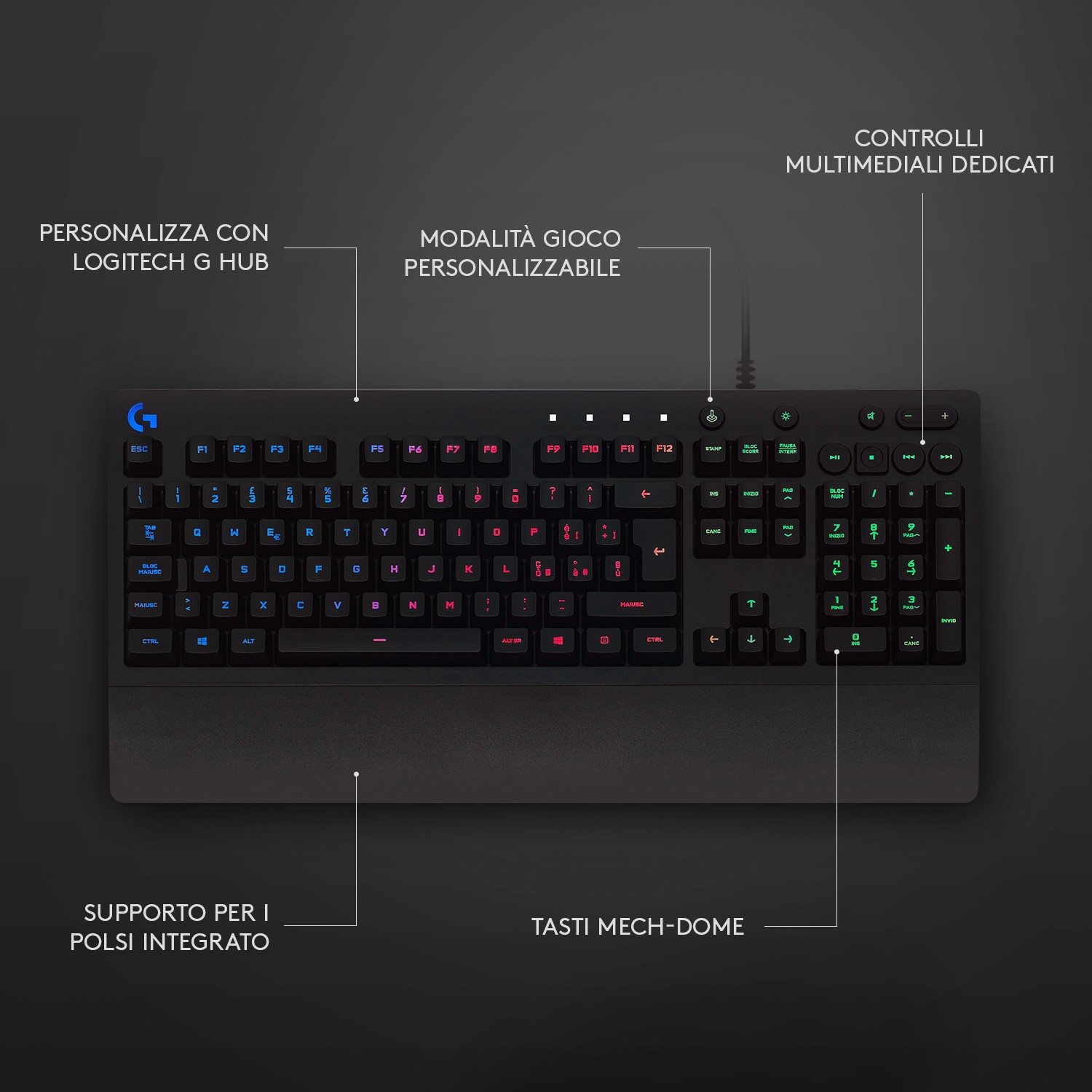 Logitech G Logitech G213 Prodigy Tastiera Gaming Cablata, LIGHTSYNC RGB, Tasti Retroilluminati, Resistente Agli Schizzi, Tasti Personalizzabili, Controlli Dedicati Multimediali, QWERTY Layout Italiano, Nero, Full-size (100%), USB, Interruttore a chia...