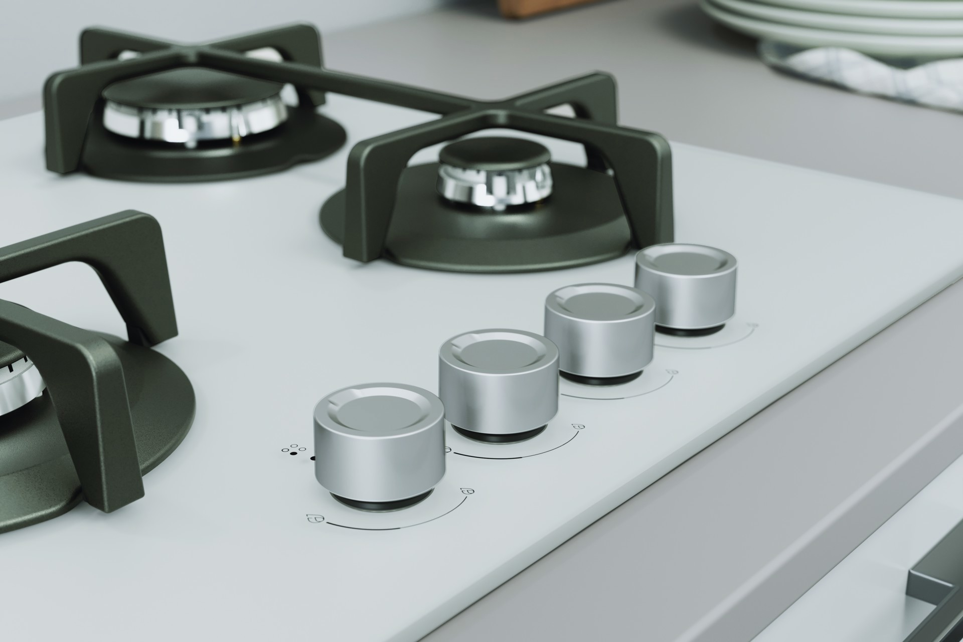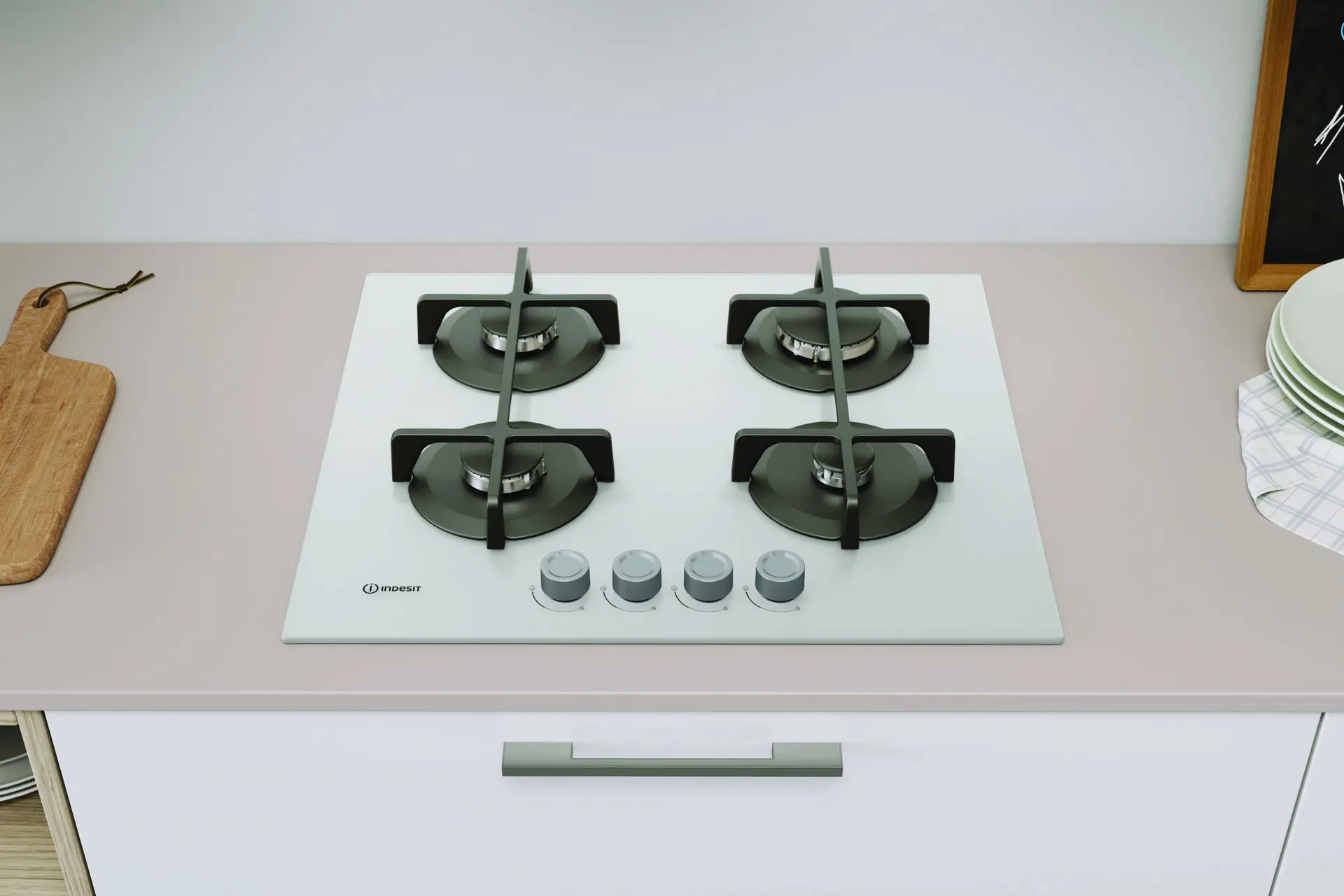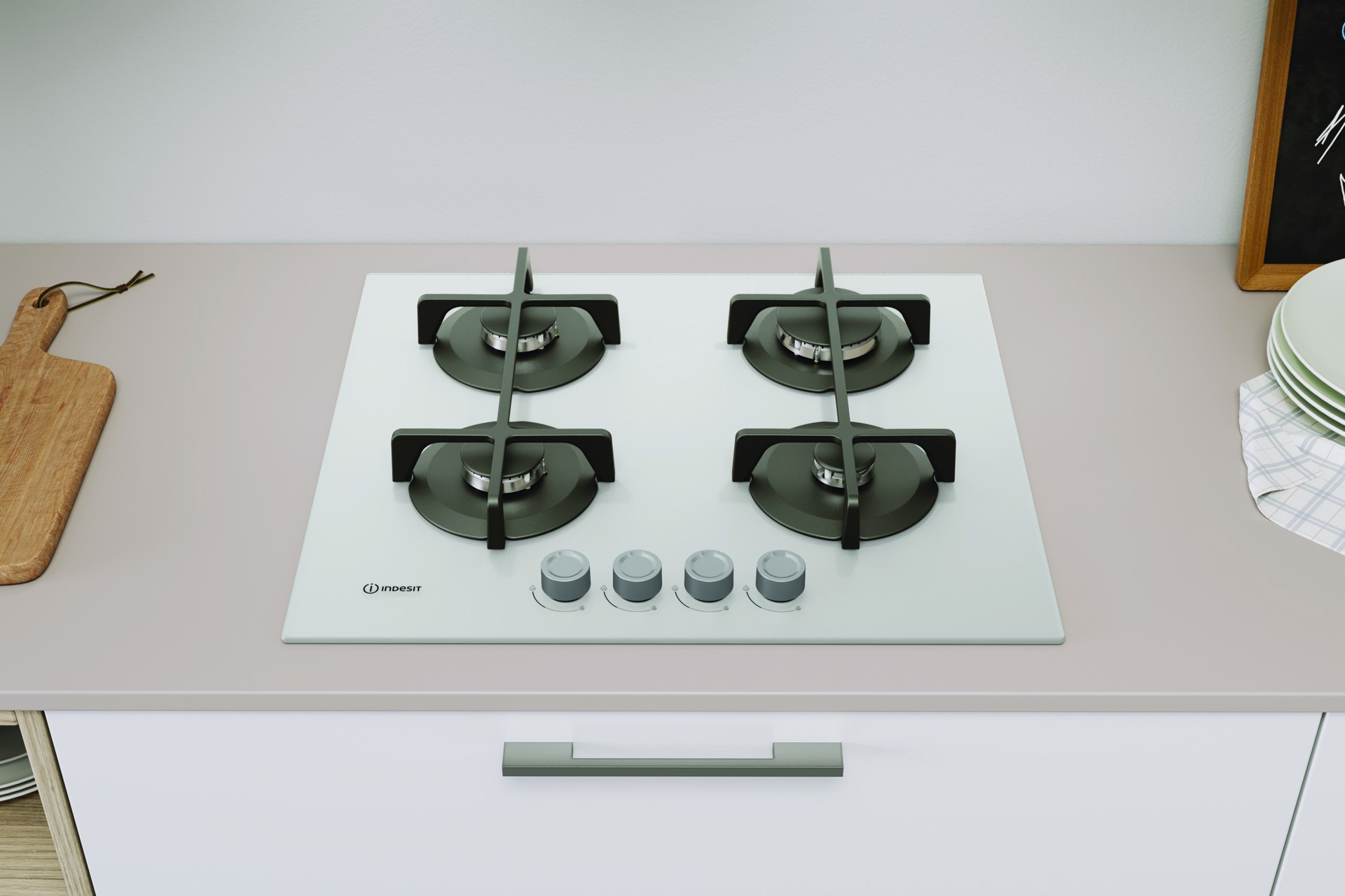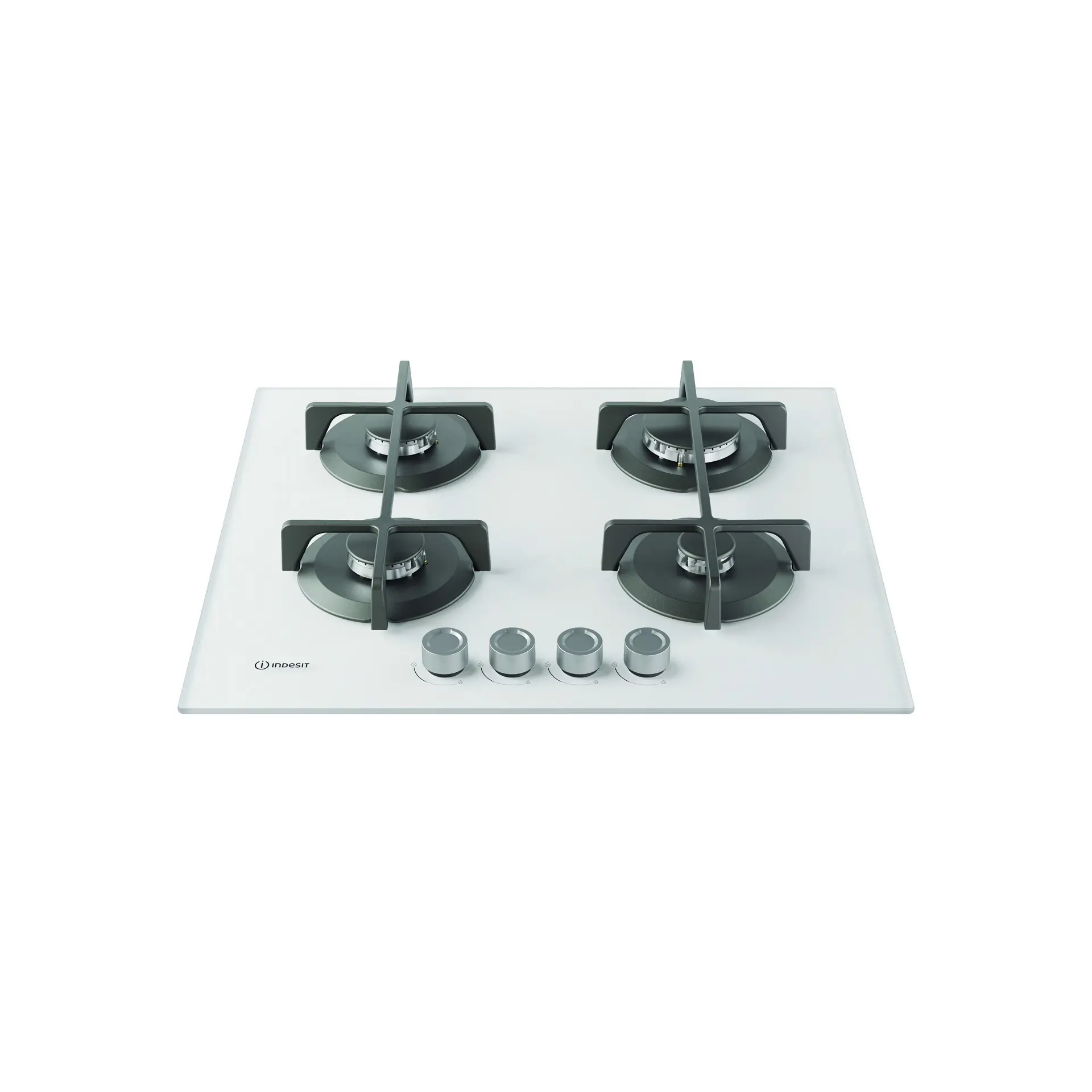 Indesit ING 61T/WH 1 piano gas vetro tortora 60cm 4 fuochi griglie in ghisa lavabili in lavastoviglie. Colore del prodotto: Bianco, Posizionamento dell'apparecchio: Da incasso, Dimensione della larghezza del piano cottura: 60 cm. Tipo di controllo: Manopola, Posizione di controllo: Frontale. Potenza aggregata (gas): 7300 W, Tensione di ingresso AC: 220-240 V, Frequenza di ingresso AC: 50/60 Hz. Larghezza: 590 mm, Profondità: 510 mm, Altezza: 49 mm. Larghezza imballo: 640 mm, Profondità imballo: 555 mm, Altezza imballo: 170 mm