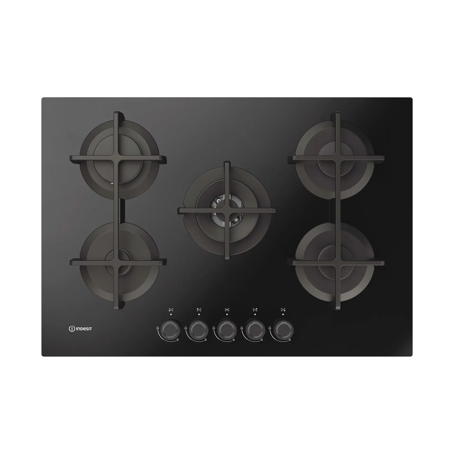 Indesit ING 72T/BK 1 piano gas vetro nero 75cm 5 fuochi bruciatore doppia corona griglie in ghisa lavabili in lavastoviglie. Colore del prodotto: Nero, Posizionamento dell'apparecchio: Da incasso, Dimensione della larghezza del piano cottura: 75 cm. Tipo di controllo: Manopola, Posizione di controllo: Frontale. Potenza aggregata (gas): 10800 W, Tensione di ingresso AC: 220-240 V, Frequenza di ingresso AC: 50/60 Hz. Larghezza: 730 mm, Profondità: 510 mm, Altezza: 51 mm. Larghezza imballo: 810 mm, Profondità imballo: 590 mm, Altezza imballo: 160 mm