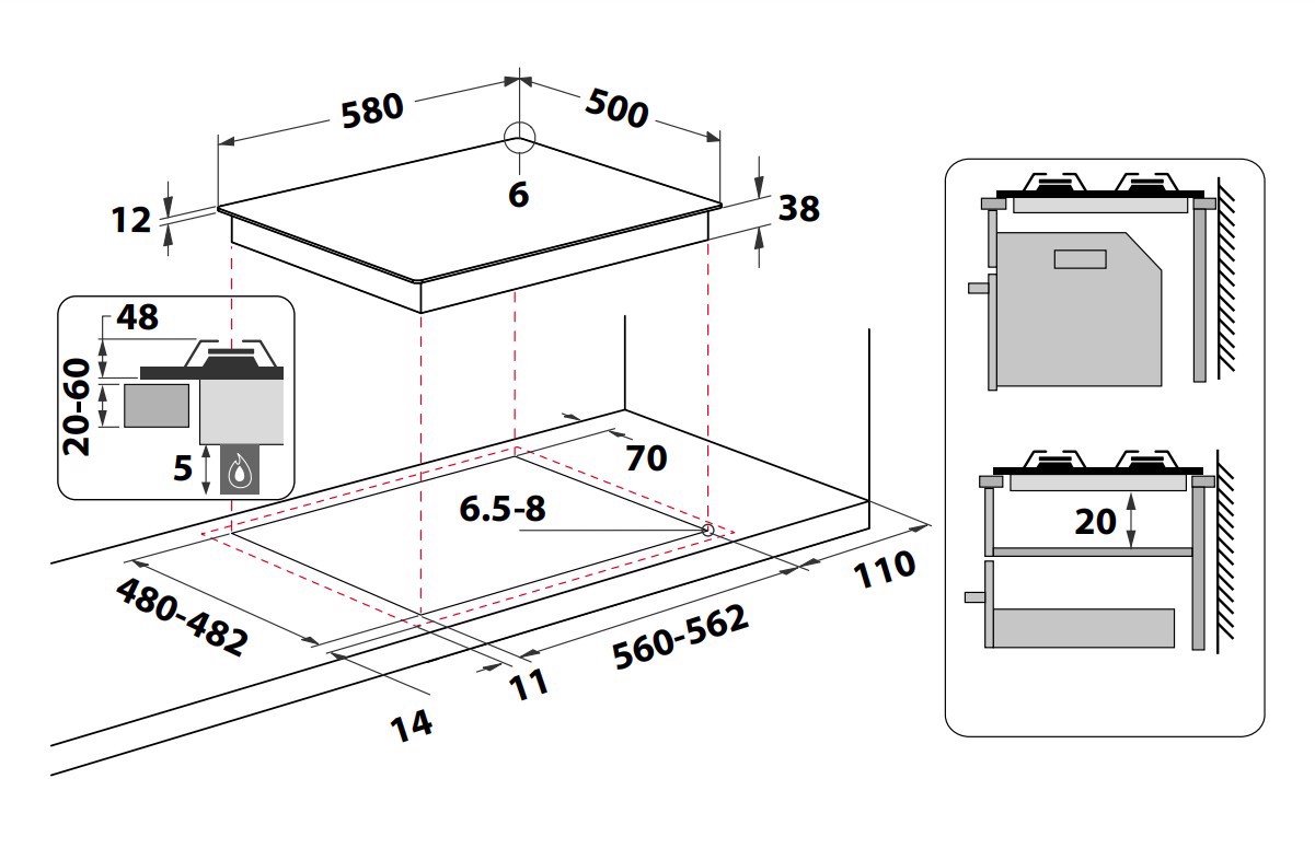 Dimensione della larghezza del piano cottura: 58 cm
