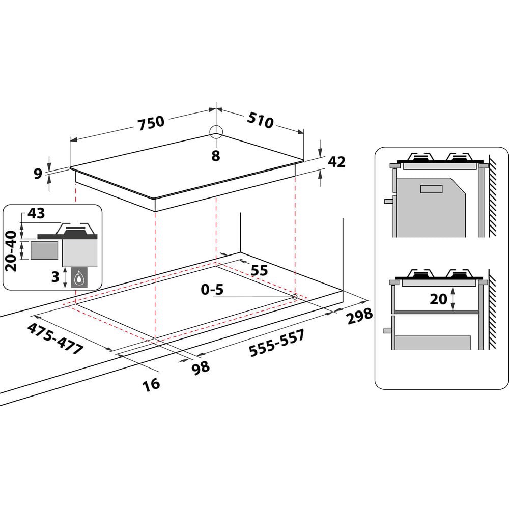 Dimensione della larghezza del piano cottura: 75 cm