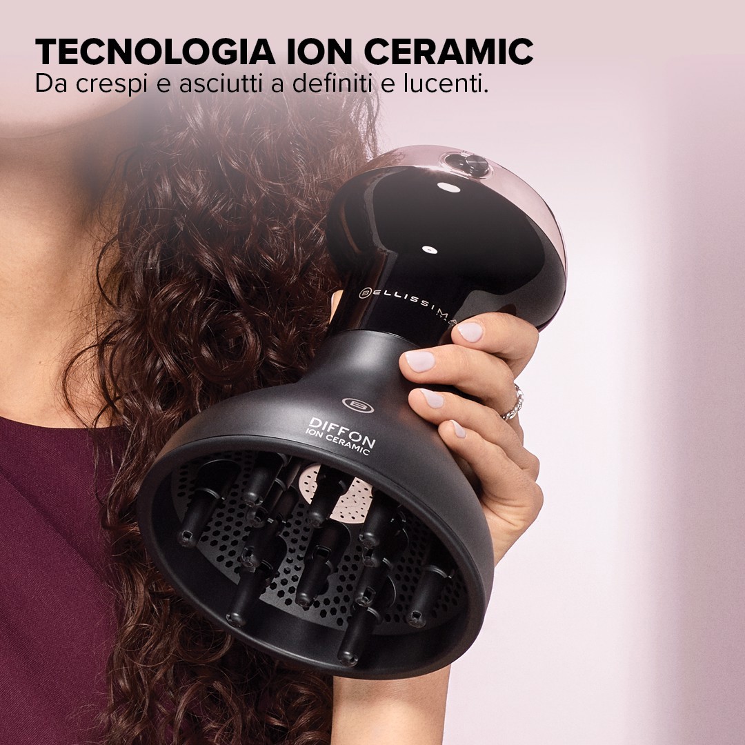 Bellissima Diffon Ion Ceramic è l’originale asciugacapelli con diffusore integrato specifico per i capelli ricci. Esalta la bellezza dei tuoi ricci naturali, rendendoli idratati e definiti con il calore buono della ceramica ionizzata che emette ioni e un calore a infrarossi che agiscono esercitando un’azione anti-crespo e anti-secco. Grazie al Curl Booster System i tuoi ricci vengono asciugati con delicatezza, senza scomporsi e mantenendo la loro forma: la griglia forata distribuisce uniformemente l’aria sulla chioma e le 12 dita lunghe tengono in posa le ciocche. Lo puoi portare anche in viaggio perché con il doppio voltaggio (110-120/220-240) si può utilizzare in tutto il mondo. Diffon ha 2 diverse combinazioni d’aria e temperatura studiate per un’asciugatura delicata. Anche la potenza di 700 W risponde all’esigenza di produrre un getto d’aria delicato che rispetti la struttura del riccio. L’impugnatura è ergonomica, studiata per poter asciugare senza fatica tutta la chioma.