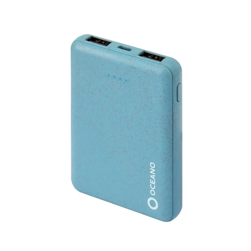 Il power bank eco-friendly da 5000 mAh della Collezione Oceano combina i vantaggi della ricarica rapida con la sostenibilità ambientale.