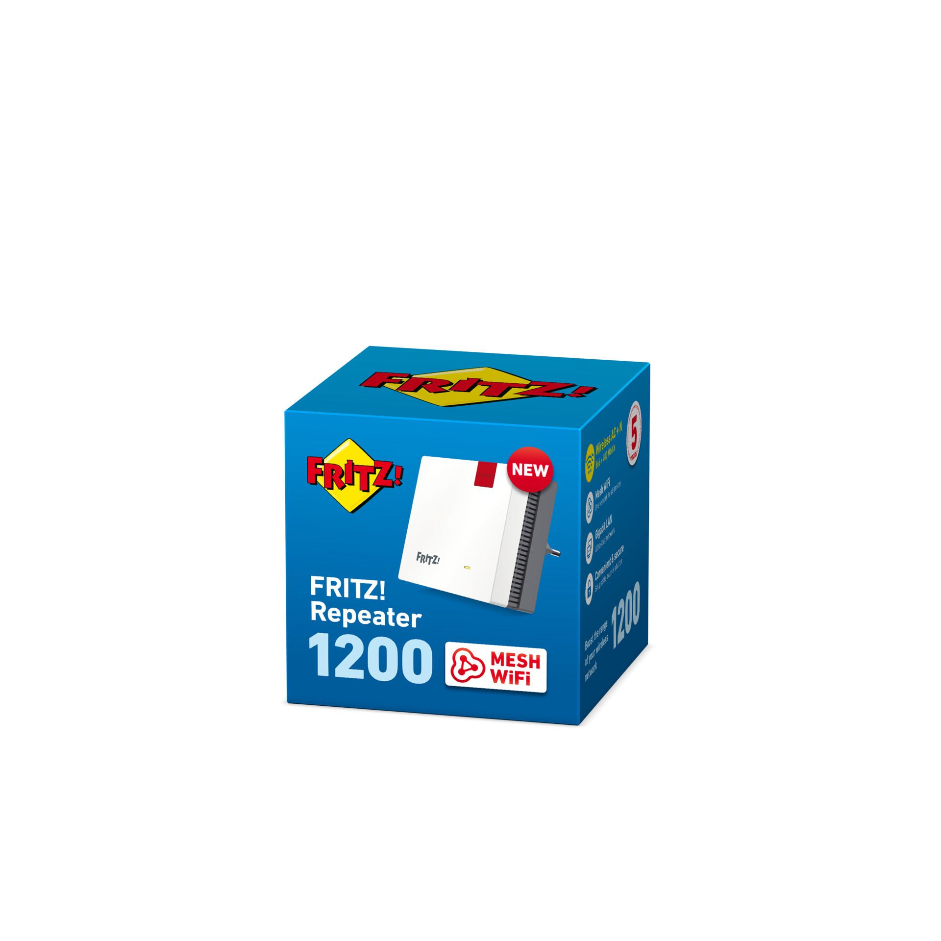 AVM FRITZ!Repeater 1200 International, 1266 Mbit/s, 400 Mbit/s, 866 Mbit/s, 10,100,1000 Mbit/s, IEEE 802.11a,IEEE 802.11ac,IEEE 802.11b,IEEE 802.11g,IEEE 802.11n, WPA2,WPA3,WPS