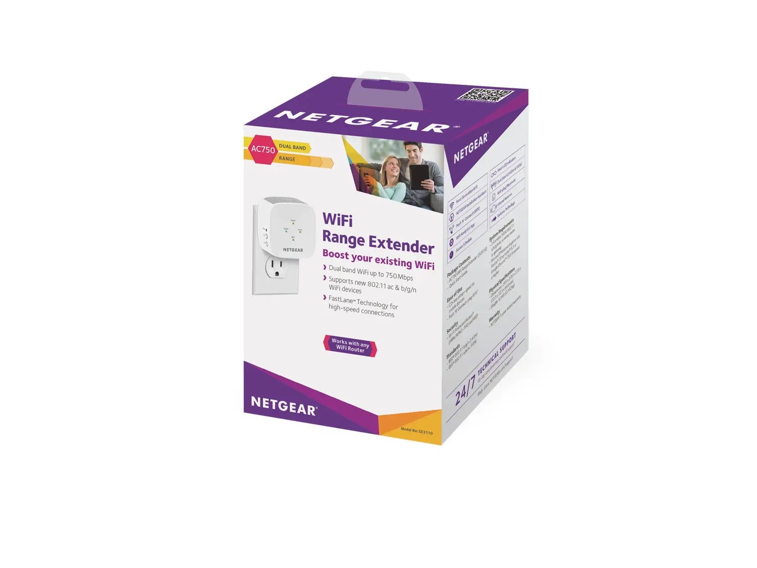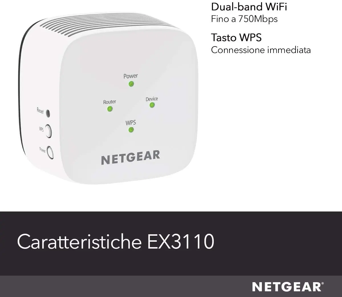 Netgear EX3110, Ricevitore e trasmettitore di rete, 750 Mbit/s, 10,100,300 Mbit/s, Microsoft ® Internet Explorer ® 8.0, Firefox ® 20, Safari ® 5.1 or Google Chrome ™ 25.0 or..., 10/100Base-T(X), IEEE 802.11a,IEEE 802.11ac,IEEE 802.11b,IEEE 802.11g,IE...