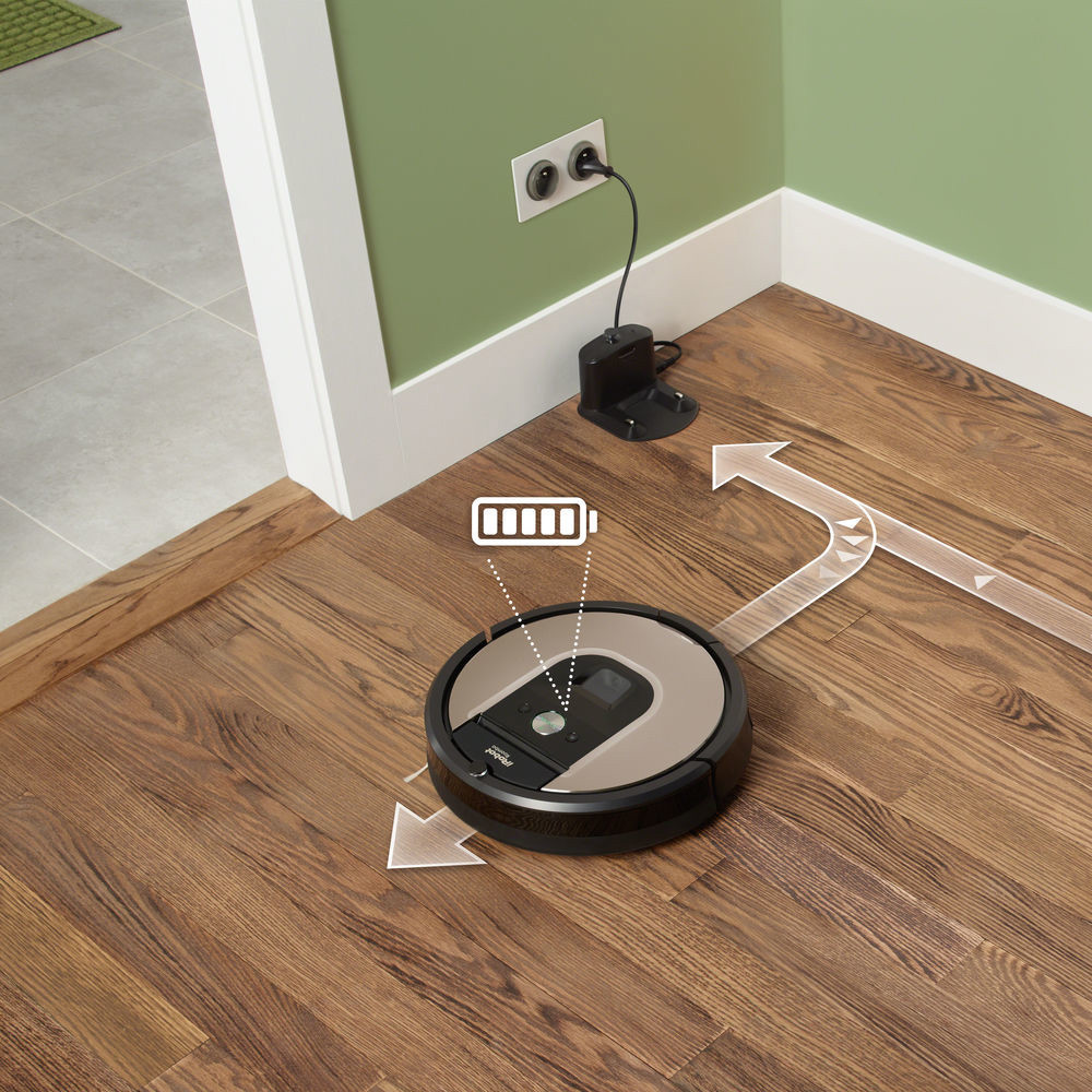 iRobot Roomba 966. Tipo di contenitore della polvere: Senza sacchetto, Colore del prodotto: Nero, Argento, Forma: Rotondo. Capacità polvere (totale): 0,6 L, Modalità di pulizia: Auto, Macchia, Tipi di superficie supportati: Tappeto, Linoleum, Piastrelle. Tecnologia batteria: Ioni di Litio, Durata di funzionamento: 75 min, Tempo di ricarica: 2 h. Diametro: 35 cm, Altezza: 91 mm, Peso: 3,9 kg. Larghezza imballo: 521 mm, Profondità imballo: 419 mm, Altezza imballo: 133 mm