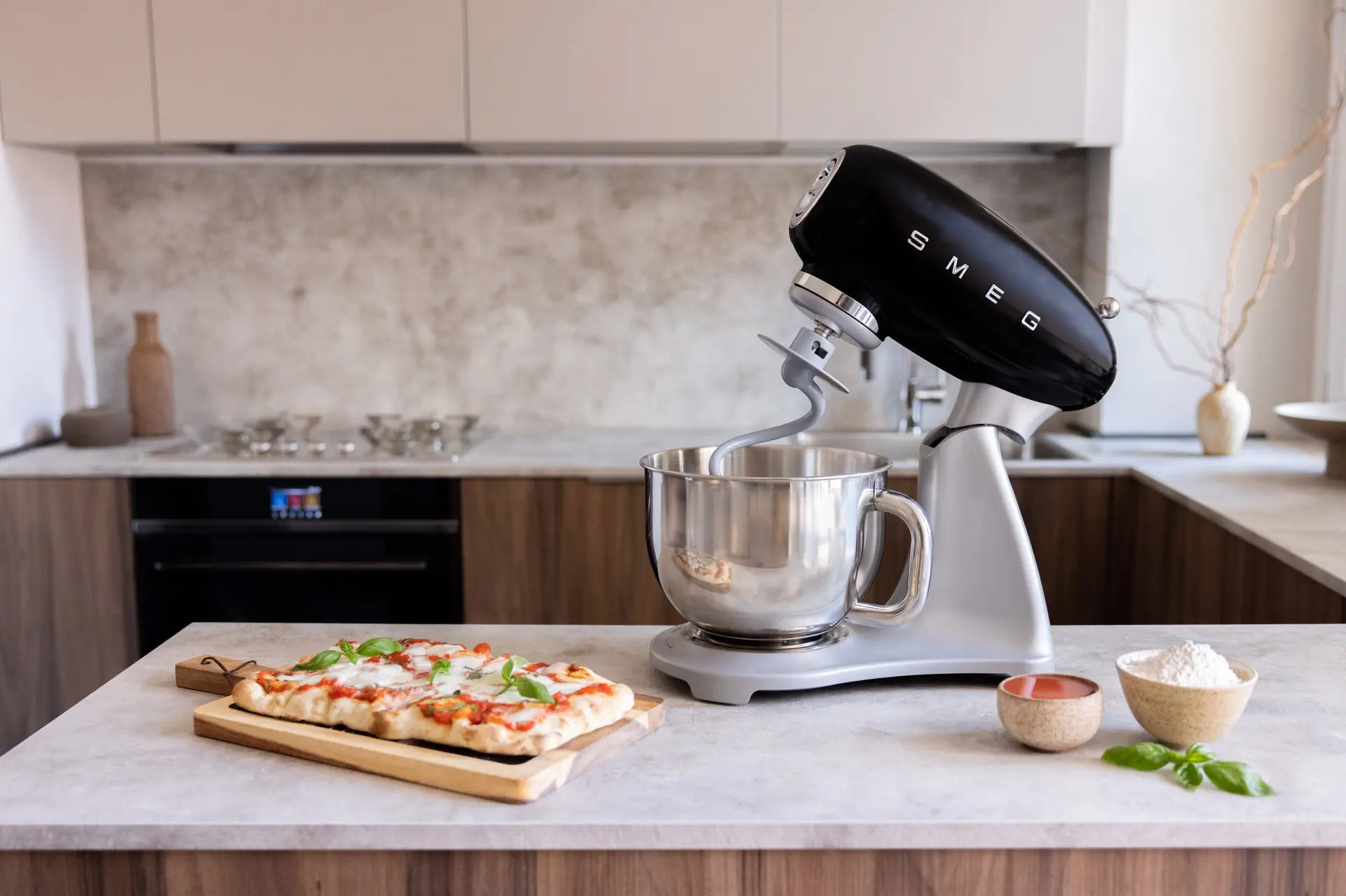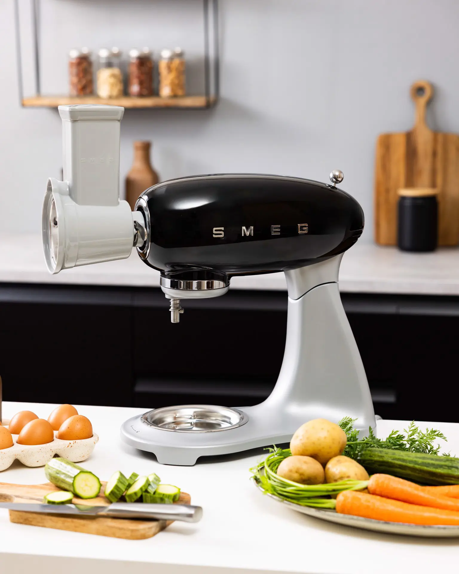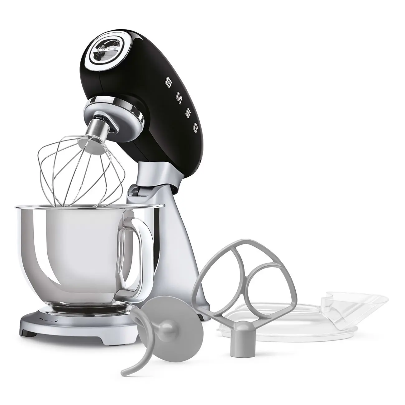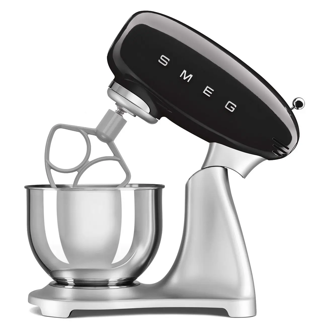 Smeg SMF04BLEU. Tipo: Sbattitore con base, Colore del prodotto: Nero, Funzioni mixer: Whisking. Materiale della scocca: Alluminio, Materiale ciotola: Acciaio inox, Materiali: Alluminio, Acciaio inox. Potenza: 800 W, Tensione di ingresso AC: 220-240 V, Frequenza di ingresso AC: 50-60 Hz. Larghezza: 405 mm, Profondità: 221 mm, Altezza: 378 mm. Larghezza imballo: 420 mm, Profondità imballo: 280 mm, Altezza imballo: 475 mm