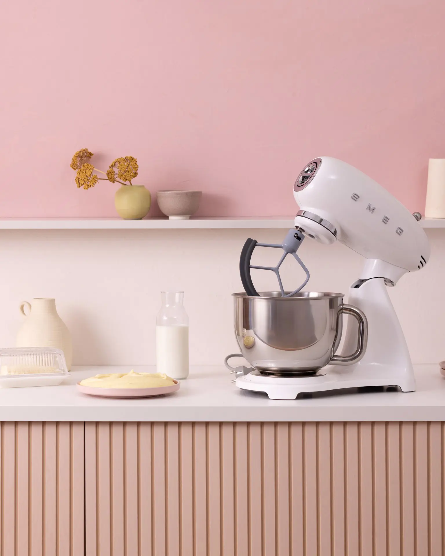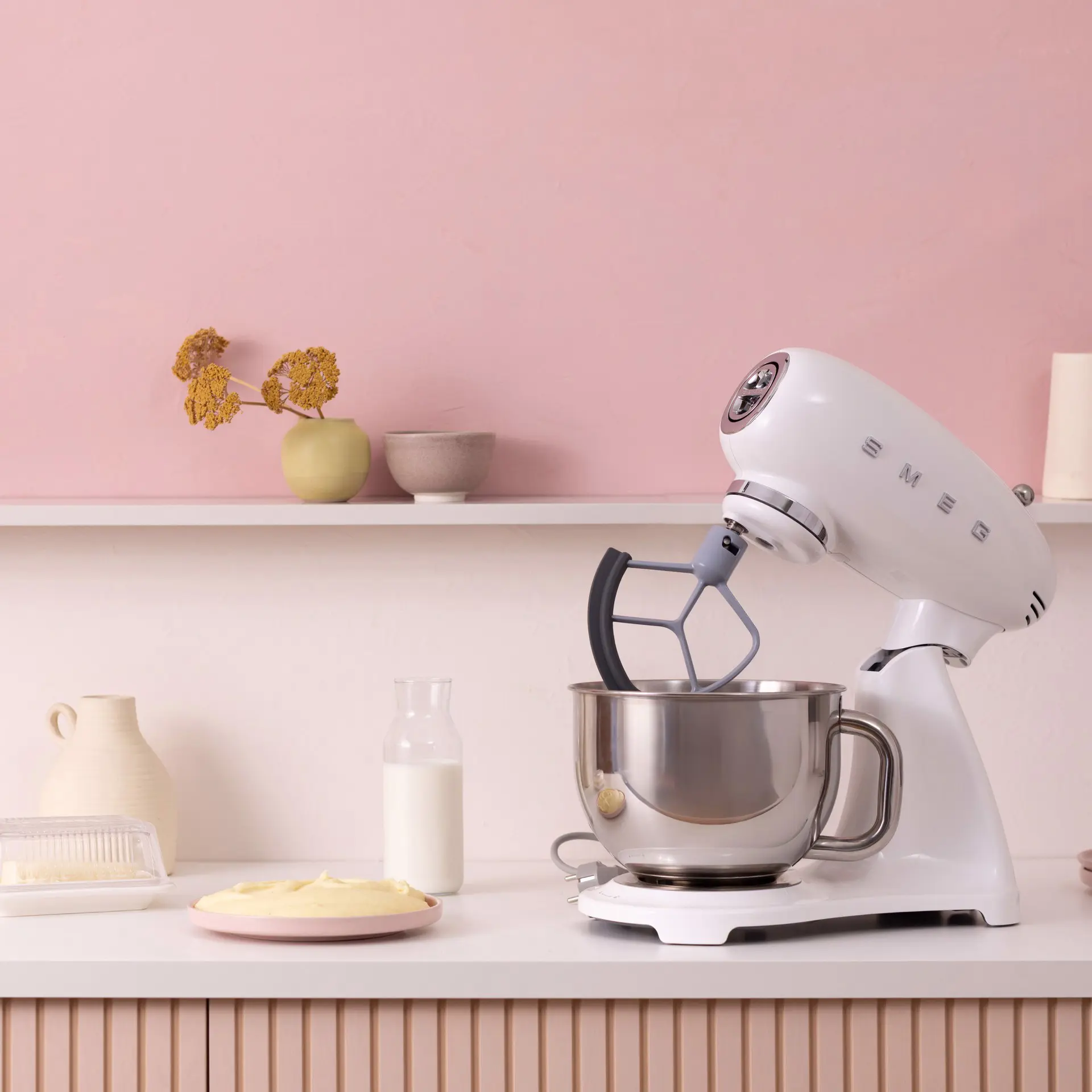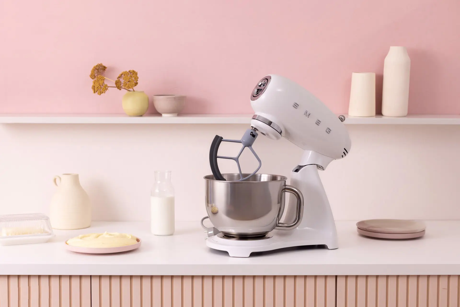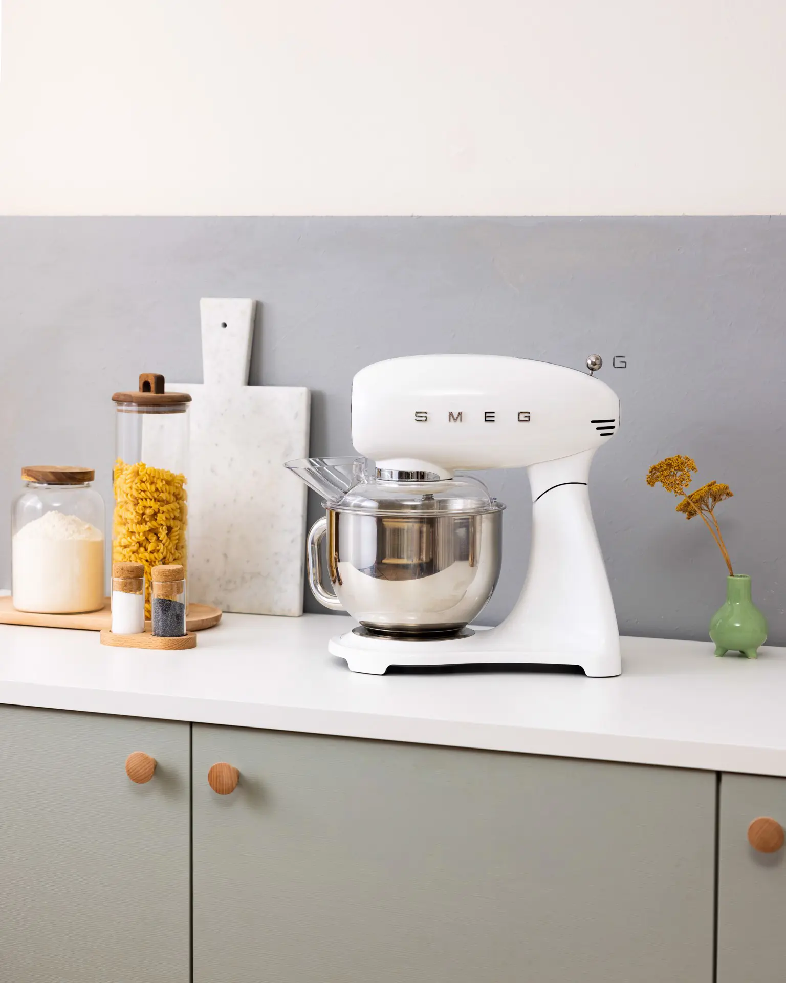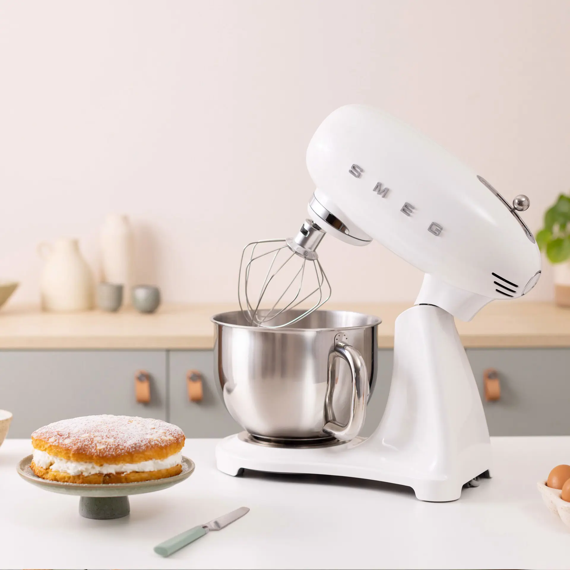 Smeg SMF05WHEU. Tipo: Sbattitore con base, Colore del prodotto: Bianco, Funzioni mixer: Sbattitura, Miscelatura, Whisking. Materiale della scocca: Alluminio, Materiale ciotola: Acciaio inox, Materiali: Alluminio, Acciaio inox. Potenza: 1000 W, Tensione di ingresso AC: 220-240 V, Frequenza di ingresso AC: 50-60 Hz. Larghezza: 405 mm, Profondità: 221 mm, Altezza: 378 mm. Larghezza imballo: 420 mm, Profondità imballo: 280 mm, Altezza imballo: 475 mm