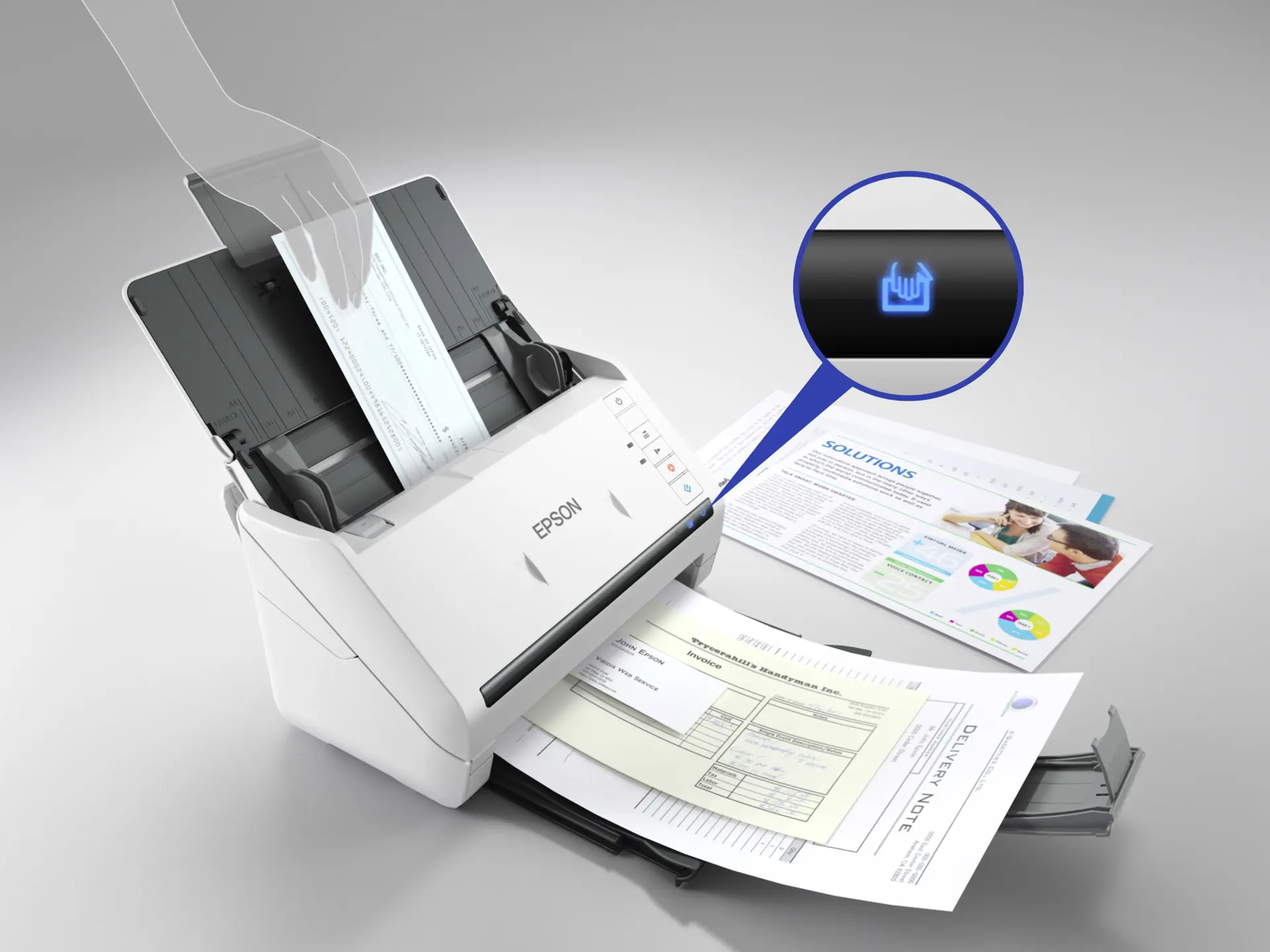 Grazie alla modalità Slow1, una novità assoluta del settore, per la scansione di documenti delicati o spiegazzati, la scansione di supporti complessi non è mai stata così semplice. Il sistema a rulli di separazione attivi impedisce inceppamenti a causa di fogli doppi garantendo la scansione di ogni singola pagina, mentre la funzione che consente di ignorare il rilevamento della doppia alimentazione permette di digitalizzare supporti potenzialmente problematici, ad esempio buste o documenti con post-it. La modalità di scansione automatica consente l'elaborazione di un notevole numero di documenti in un unico file.