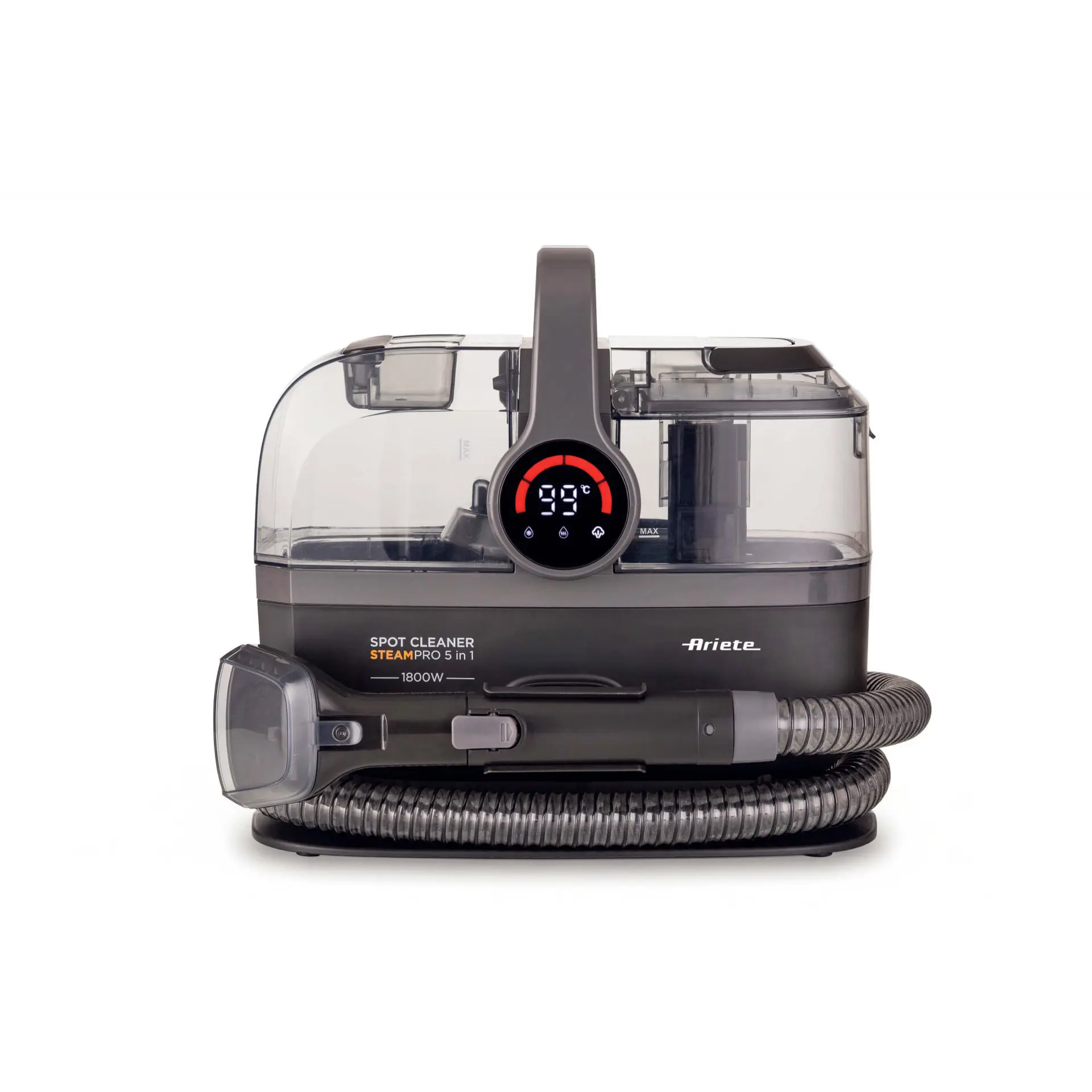 ARIETE 2484 Spot Cleaner Steam PRO 5in1, Lavatappeti e pulitore a vapore, Elimina macchie da interni Auto, Divani, Moquette, Materassi, tappeti, 1800W, 3 modalità di pulizia, Elevata potenza aspirante, Pet care, 2 serbatoi