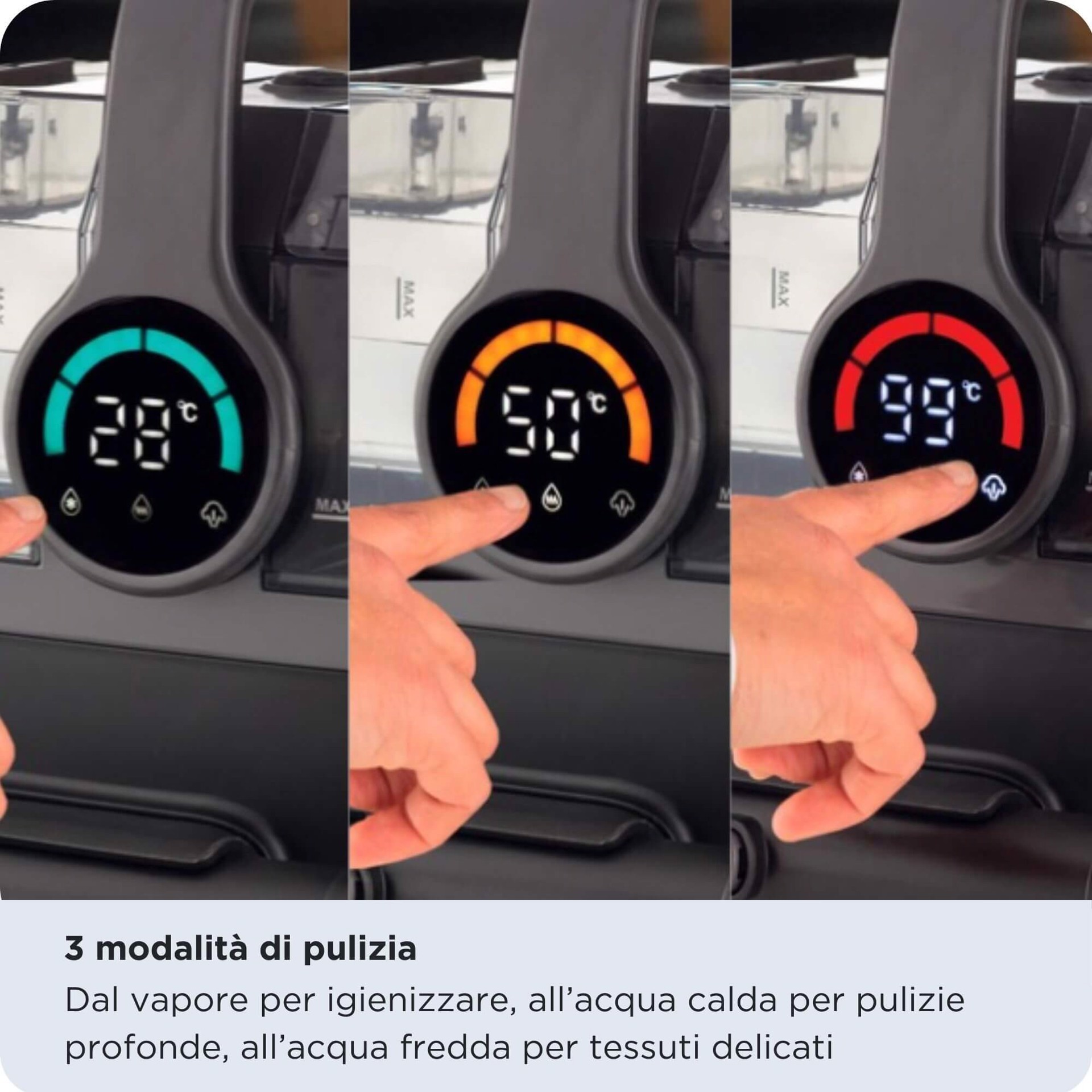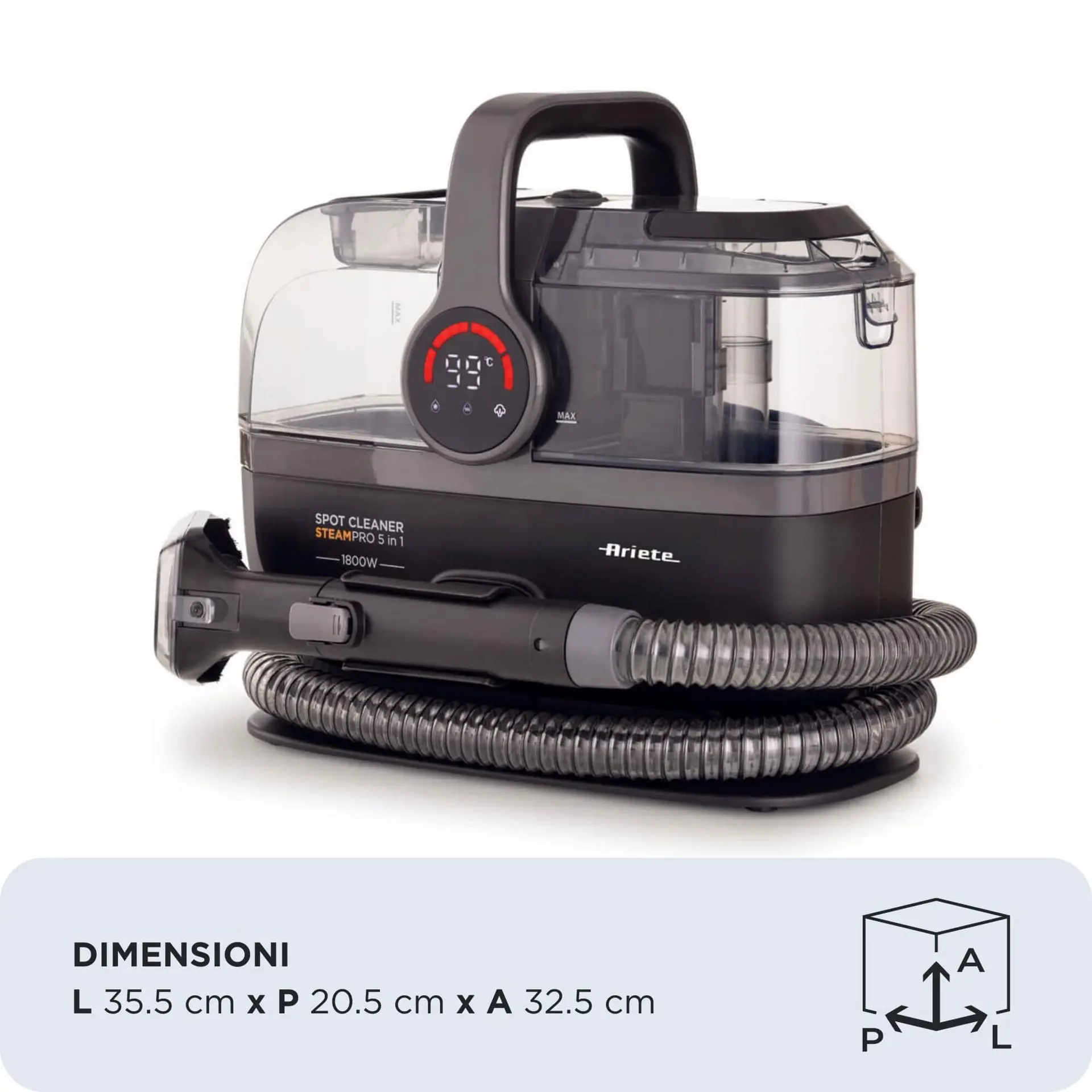 Dimentica l'ansia da macchia sul divano nuovo o lo stress per i "pasticci" del tuo animale domestico. Lo Spot Cleaner Steam PRO 5in1 unisce la pulizia a vapore profonda, con la potente aspirazione liquida e solida. Non si limita a pulire la superficie ma arriva al cuore della fibra. Ecco come questa tecnologia lavora in sinergia per te:Vapore & calore: il primo attacco è termico. Il getto di vapore ammorbidisce istantaneamente lo sporco, sciogliendo il legame chimico tra la macchia e il tessuto.Soluzione detergente: opzionale ma vincente per l'unto. Utilizzando un detergente specifico poco schiumoso, attacchiamo i pigmenti e le sostanze grasse.Aspirazione potente: grazie alla potenza da 1800W, una volta che lo sporco è "slegato", la potente aspirazione lo estrae insieme all'acqua sporca, lasciando la superficie pulita e quasi asciutta.Il Consiglio di Ariete: se hai di fronte una macchia vecchia o particolarmente unta? Non avere fretta. Pre-tratta l'area con la soluzione detergente, lascia agire qualche minuto, e solo dopo procedi con il vapore e l'aspirazione. Il risultato ti stupirà.Spot Cleaner Steam PRO 5in1 è ideale per affrontare le sfide quotidiane più difficili:L'incubo di cibo e bevande: caffè, vino rosso, succhi di frutta o salse (come ketchup e pomodoro) non fanno più paura. Il calore scioglie gli zuccheri e le proteine coagulate, cancellando gli aloni.Unto e grasso: sono le macchie più temute, ma la combinazione di vapore e detergente fluidifica l'olio, permettendo all'aspirazione di sollevarlo via per sempre.Fango e sporco profondo: anche il fango secco viene reidratato e ammorbidito, per essere poi estratto dalle profondità delle fibre.I “pasticci” degli animali a 4 zampe: che si tratti di urina, vomito o impronte di fango, Spot Cleaner Steam non si limita a rimuovere la macchia visibile. La potenza del vapore e l'alta temperatura igienizza la superficie, neutralizzando i batteri responsabili dei cattivi odori. Non copri l'odore, lo elimini alla radice. Perfetto per le case con animali domestici e bambini.Inoltre, il vapore penetra nelle fibre dei tessuti di tappeti e materassi per eliminare acari, allergeni e polvere nascosta, garantendo un ambiente più sano per tutta la famiglia.Non tutti i tessuti sono uguali, per questo dal display digitale è possibile scegliere tra 3 modalità di pulizia distinte:Modalità Vapore: per igienizzare e sciogliere lo sporco ostinato.Modalità Acqua Calda: per un lavaggio profondo ed efficace.Modalità Acqua Fredda: ideale per tessuti delicati o specifici, come gli interni auto, dove spesso è preferibile non utilizzare temperature elevate per proteggere colle e rivestimenti.In dotazione:Spazzola in gomma per rimozione peli: perfetta per catturare peli e capelli mentre pulisci, anche per le cucce dei tuoi amici a 4 zampe.Lavavetri: trasforma il tuo spot cleaner in un pulitore per finestre,vetri, box doccia, specchi e superfici dure.Spazzola per angoli: per pulire e igienizzare anche i punti più nascosti della tua casaBocchetta a vapore con piastra per stirare in verticale: elimina pieghe da tessuti, tende, e capi di abbigliamento in un attimoDoppio serbatoio: l'acqua pulita nel serbatoio da 1,7L non entra mai in contatto con quella sporca del serbatoio da 1,1L, garantendo un'igiene massima.Auto-pulizia del tubo: Hai finito di pulire? Basta aspirare acqua pulita per risciacquare automaticamente il tubo interno. Zero fatica, massima durata del prodotto.