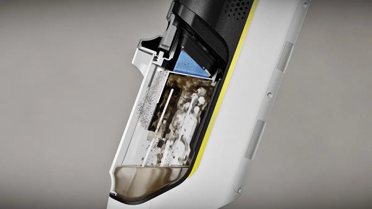 Il sistema di filtraggio multistadio protegge in modo affidabile il motore dall'umidità. Eccellente filtraggio con filtro pieghettato piatto altamente efficiente: intrappola efficacemente anche le particelle più piccole nell'aria. Modalità asciugatura ideale per l'uso su tappeti e moquette