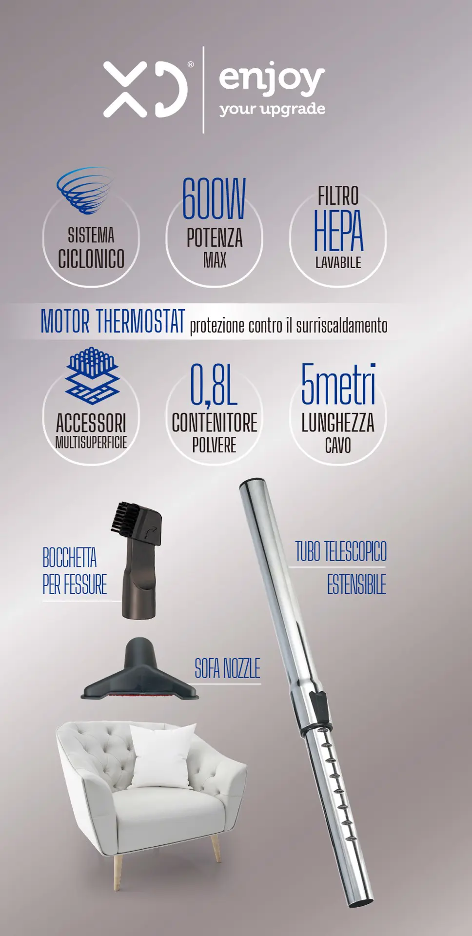XD Enjoy Scopa Elettrica Ciclonica A Filo 600W - Convertibile In Aspirabriciole