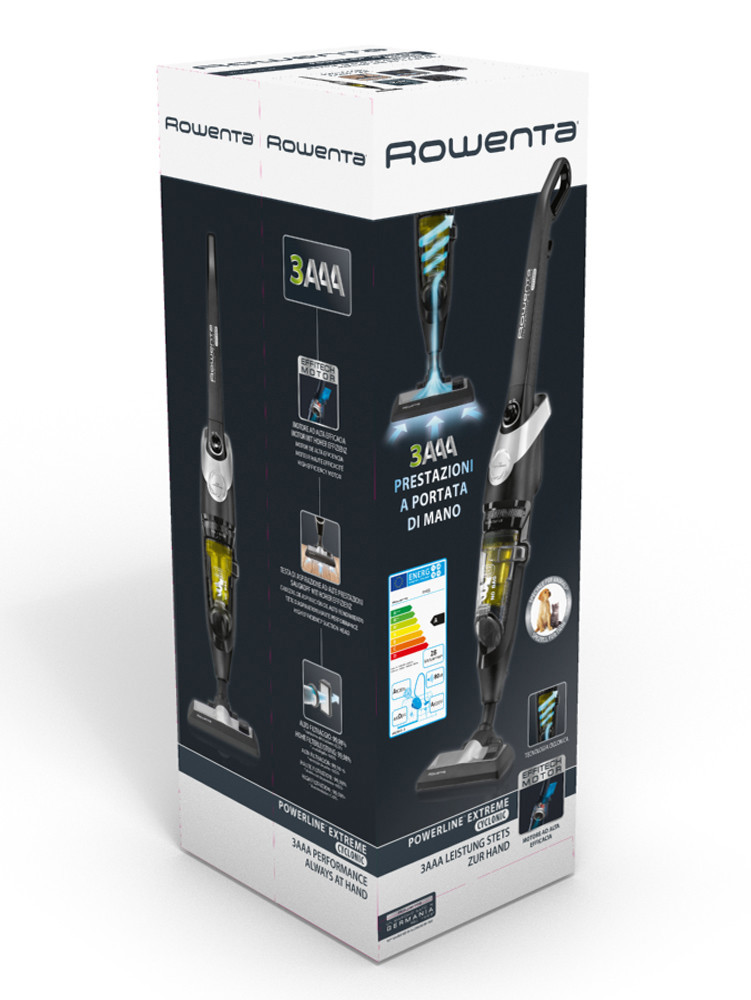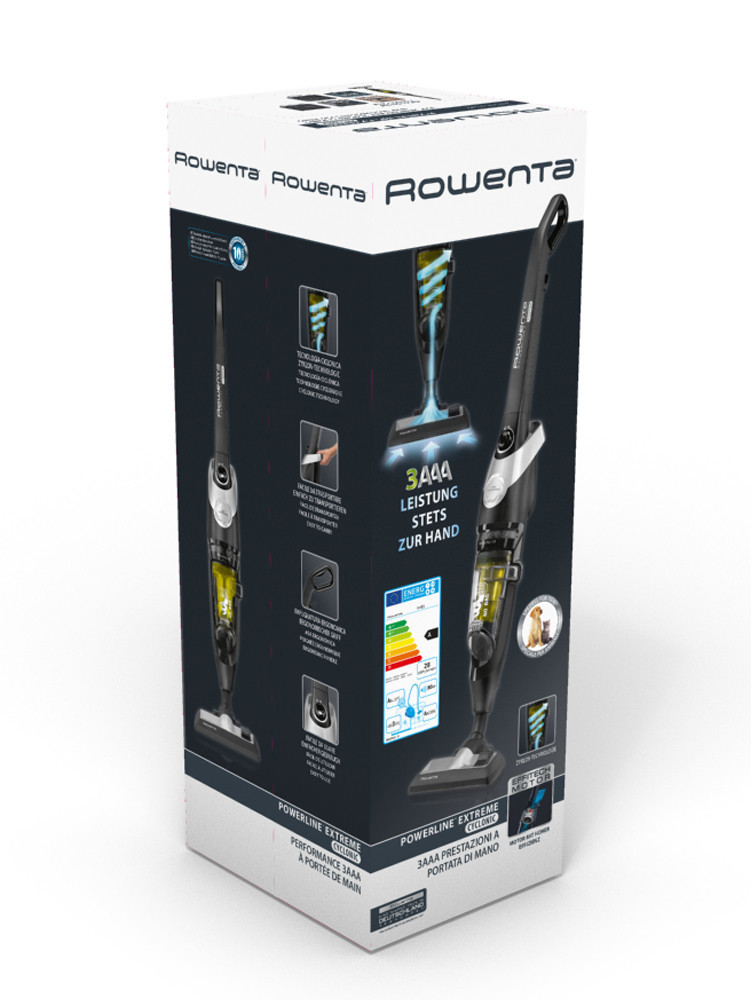 Rowenta POWERLINE EXTREME BAGLESS. Tipo di contenitore della polvere: Senza sacchetto, Colore del prodotto: Nero, Argento, Giallo, Capacità del contenitore: 0,9 L. Tipo di pulizia: Secco, Sistema di filtraggio dell'aspirapolvere: Ciclonico, Metodo di separazione dello sporco: Ciclonico. Lunghezza cavo: 8 m, Controllo dell'energia: Elettronico. Alimentazione: AC, Massima potenza in entrata: 750 W, Consumo energetico annuo: 28 kWh. Larghezza imballo: 295 mm, Profondità imballo: 730 mm, Altezza imballo: 250 mm