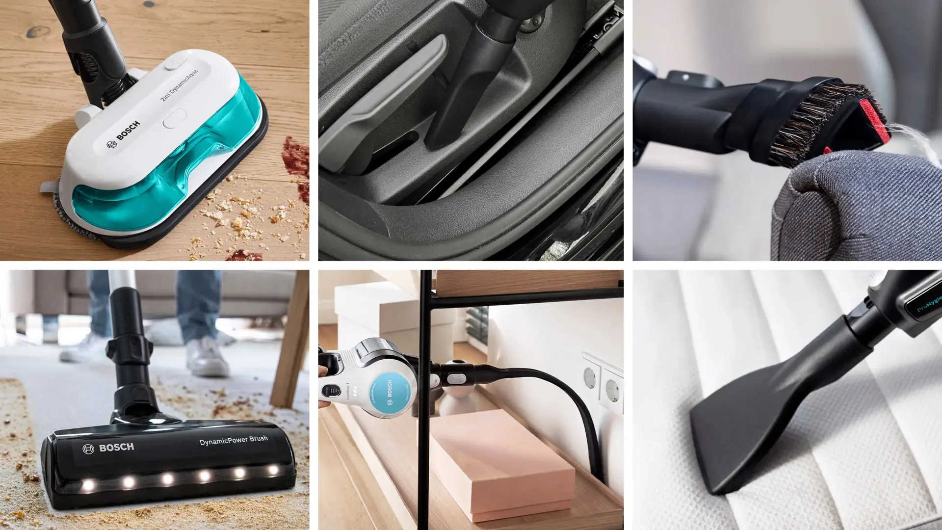 Unlimited 7 ProHygienic Aqua è dotata di due spazzole che combinano flessibilità e facilità di utilizzo: la spazzola DynamicAqua 2in1 per aspirare e lavare in un'unica soluzione i pavimenti e la spazzola DynamicPower AllFloor per aspirare efficacemente ogni tipo di superficie. Inoltre, il pratico tubo flessibile consente di raggiungere facilmente i mobili bassi o i divani senza doversi chinare.
