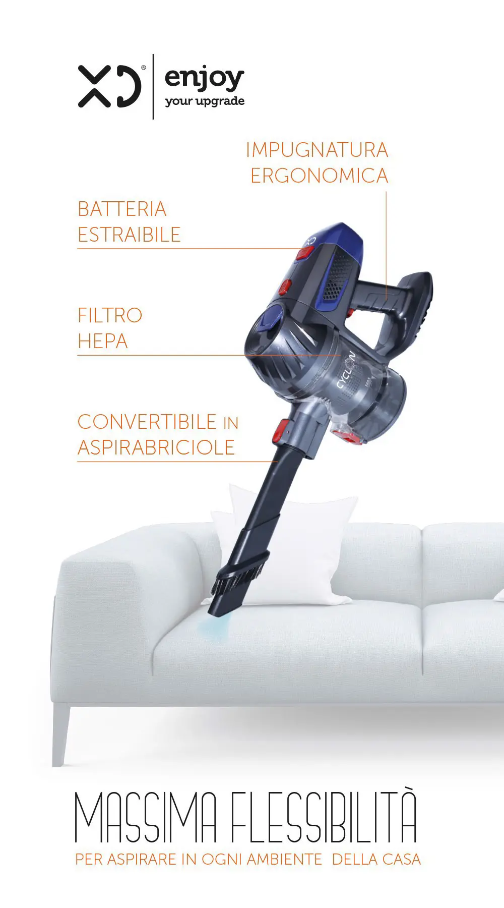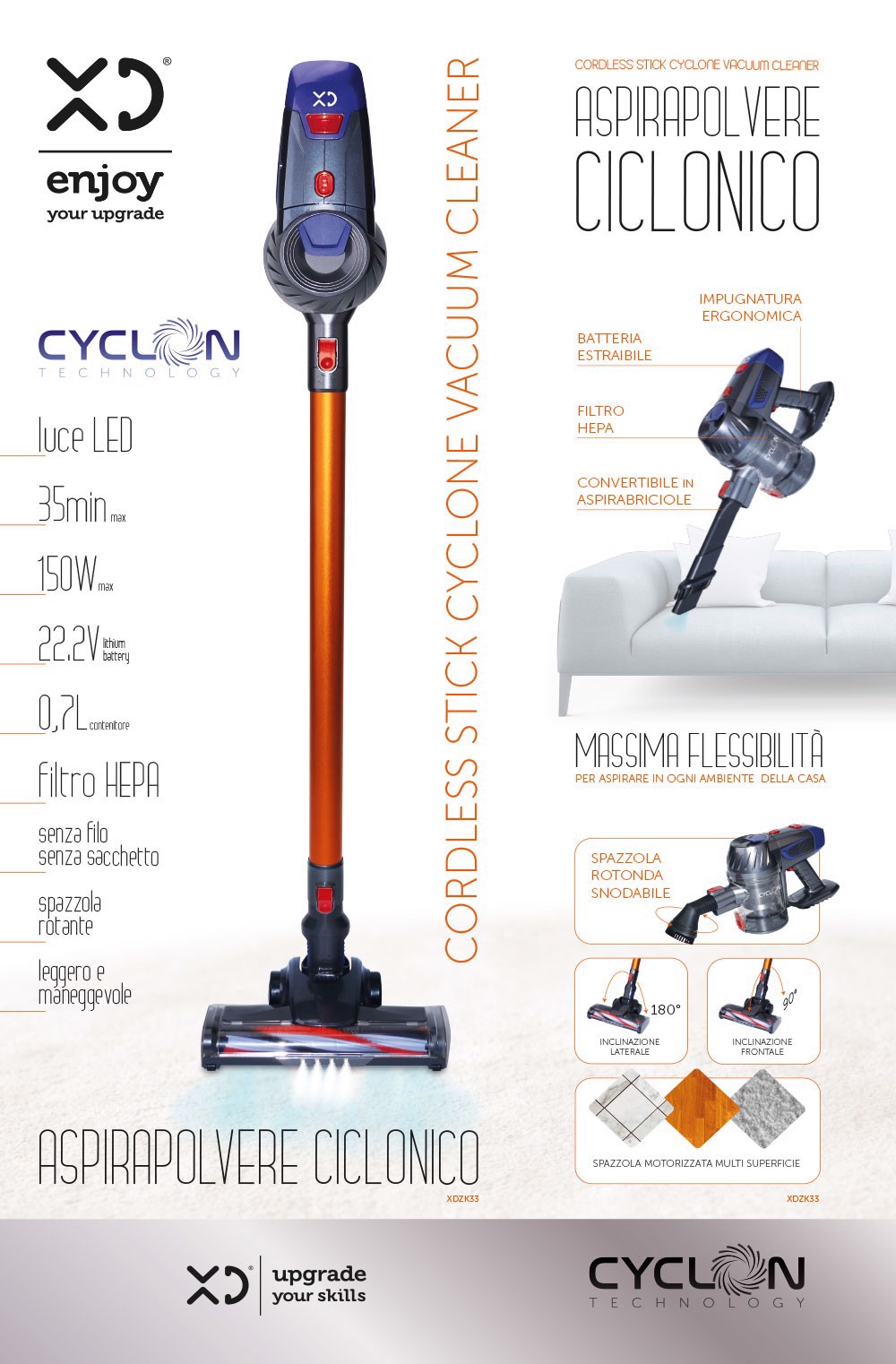 XD Enjoy XDZK33 aspirapolvere senza filo Grigio, Arancione, Rosso Senza sacchetto