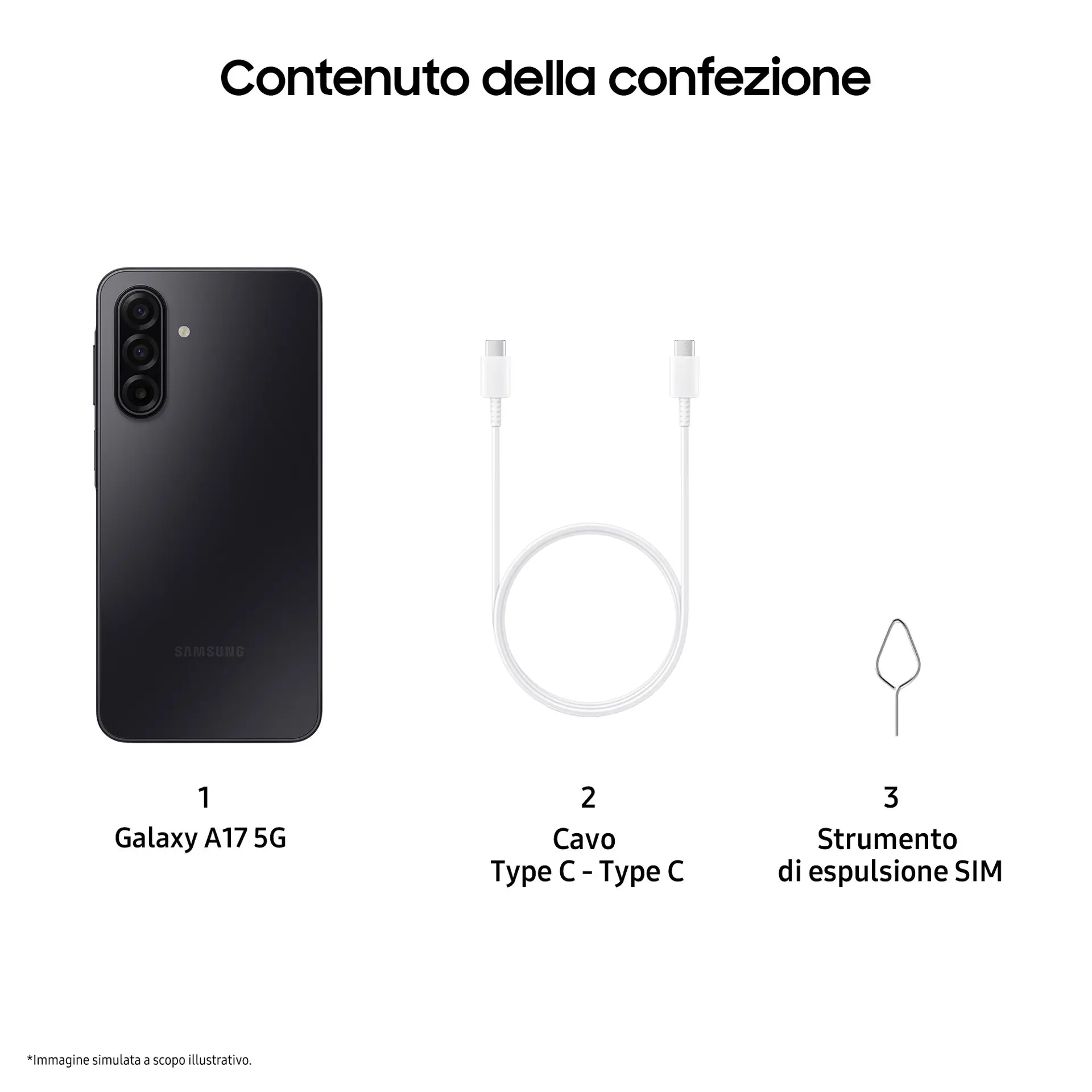 Samsung Galaxy A17 5G, Android 15, Display sAMOLED 6.7", 8GB RAM, 256GB, Batteria 5.000 mAh, Resistenza IP54, Memoria espandibile fino a 2TB, Black. Dimensioni diagonale schermo: 17 cm (6.7"). Capacità della RAM: 8 GB, Capacità memoria interna: 256 GB. Tipo di fotocamera posteriore: Tripla fotocamera. Capacità della batteria: 5000 mAh. Colore del prodotto: Nero
