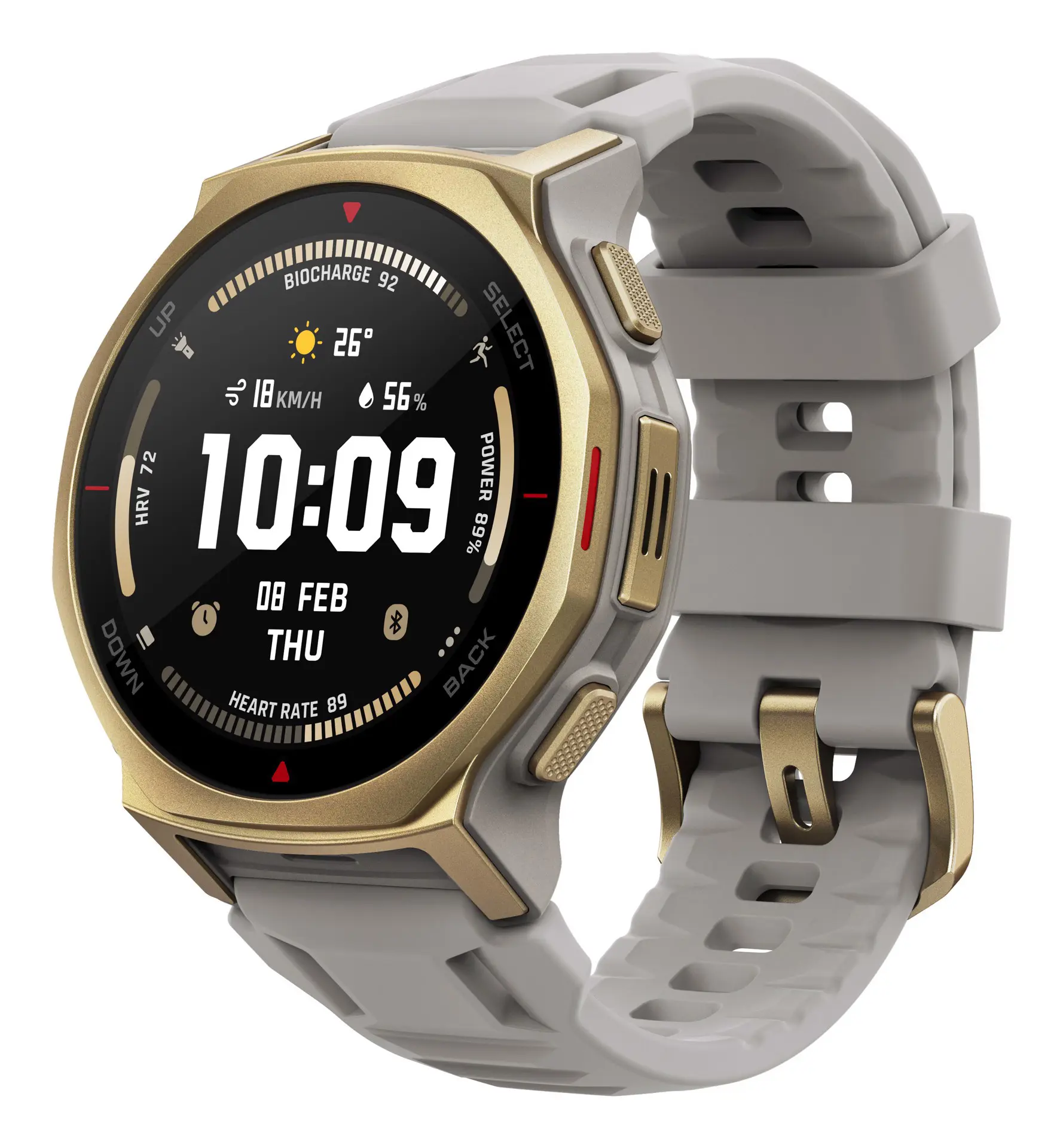 Amazfit T-rex 3 Pro. Dimensioni diagonale schermo: 3,35 cm (1.32"), Tecnologia display: AMOLED, Risoluzione del display: 466 x 466 Pixel, Touch screen. Capacità RAM: 64 MB, Memoria flash: 16 GB. Wi-Fi. GPS (satellitare). Capacità della batteria: 640 mAh. Peso: 46,8 g. Impermeabile fino a: 45 m, Materiale cinturino: Silicone, Colore cinturino: Grigio