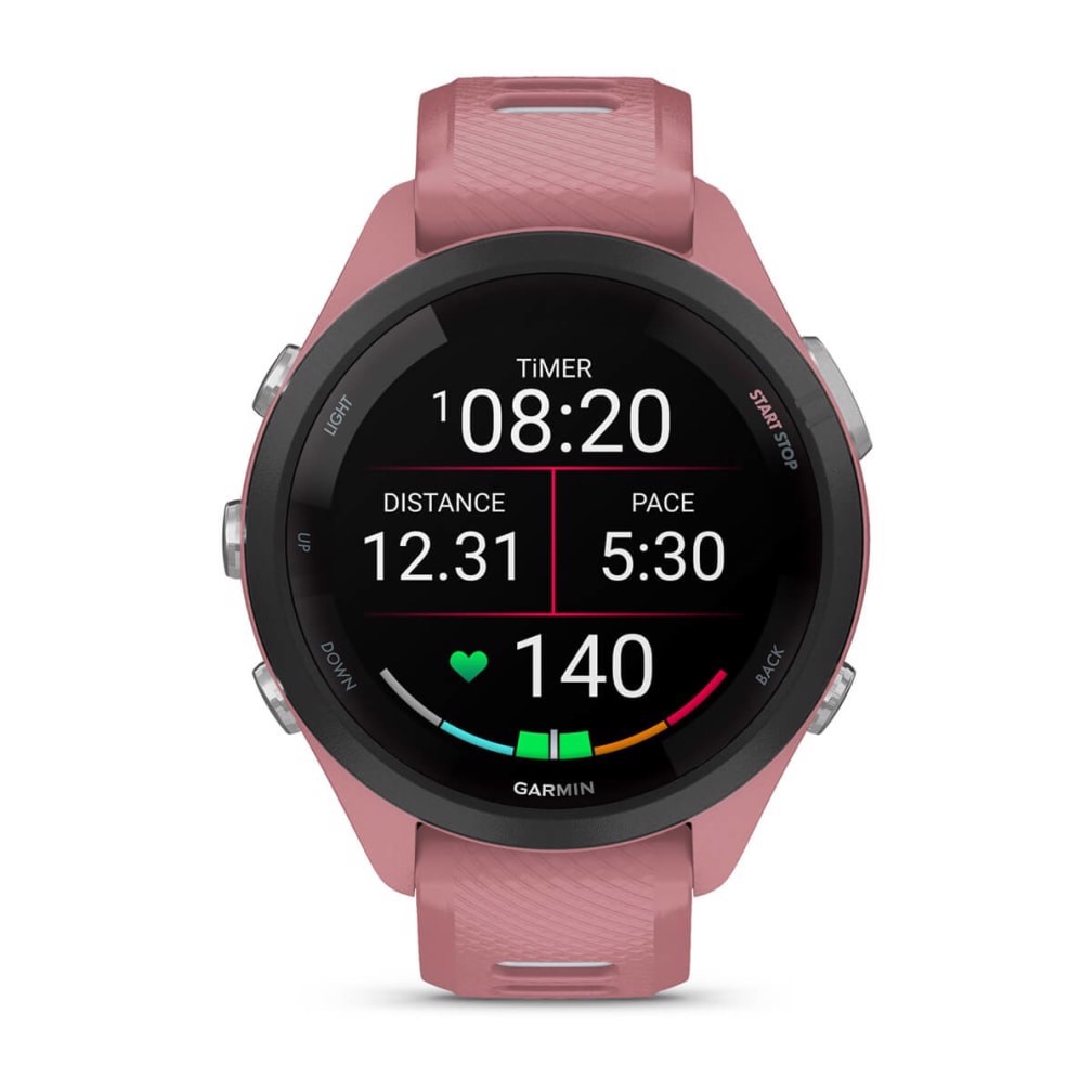Garmin Forerunner 265S. Dimensioni diagonale schermo: 2,79 cm (1.1"), Tecnologia display: AMOLED, Risoluzione del display: 360 x 360 Pixel, Touch screen. Memoria flash: 8 GB. Wi-Fi. GPS (satellitare). Peso: 39 g. Materiale cinturino: Silicone, Colore cinturino: Rosa, Bianco, Dimensione del cinturino: Taglia unica