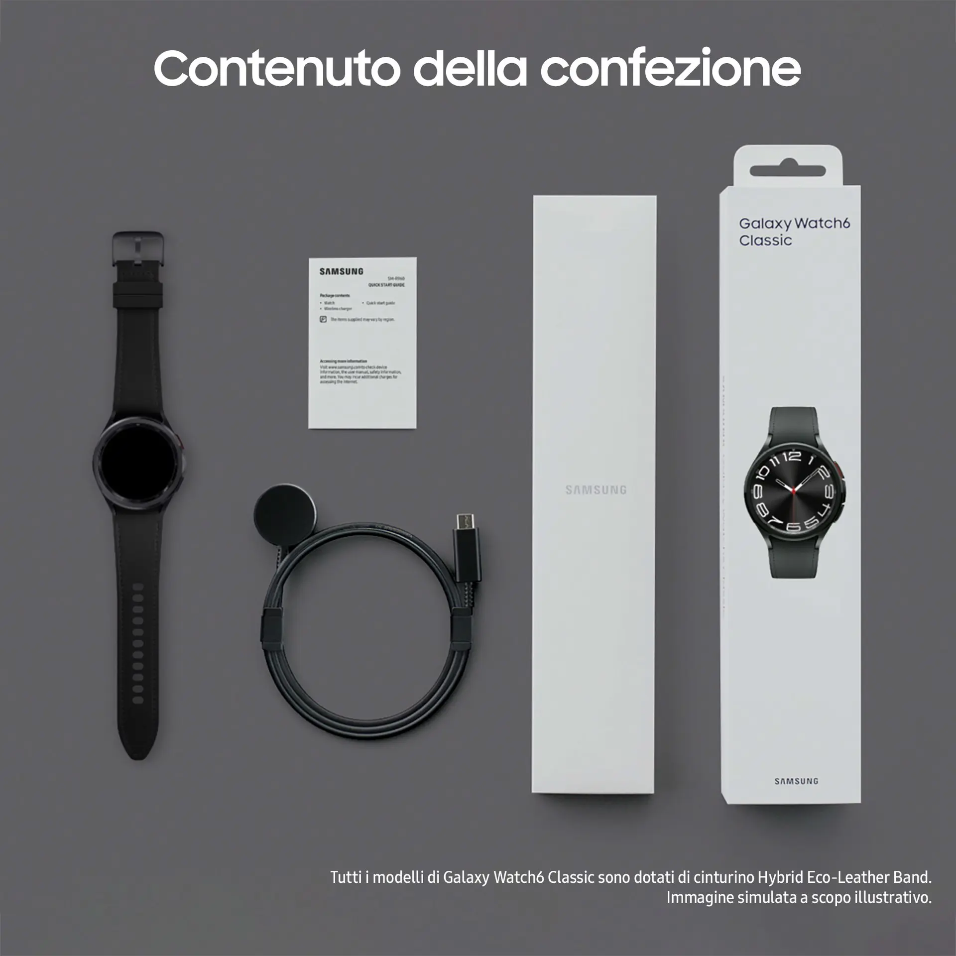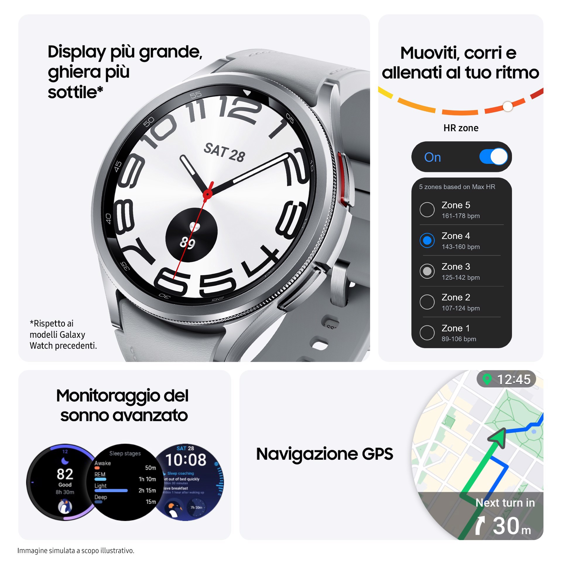 Pensato per chi ama l’avventura, Galaxy Watch6 Classic segue i tuoi progressi e ti accompagna lungo il tuo viaggio. Supera i tuoi limiti anche durante le sfide più impegnative, tieni traccia dei percorsi con il sistema di navigazione GPS e immergiti nella prossima avventura.1,2 La sottile ghiera interattiva porta la storia nel futuro con uno scorrimento più fluido e reattivo, e spazio extra sul display per ogni tocco e scorrimento.3,4 Rimani informato sui tuoi dati di benessere: Galaxy Watch6 Classic misura e tiene traccia della pressione sanguigna,5,6 monitora il battito cardiaco7 e tiene sotto controllo la salute cardiovascolare.5,6 Crea nuove abitudini di benessere giornaliere supportato dalla tecnologia di rilevamento del sonno che traccia le fasi del tuo riposo.8,9 Abbina il tuo Galaxy Watch6 Classic a uno smartphone Samsung Galaxy e gestisci chiamate, messaggi e musica dallo smartwatch.10,11,12 Inoltre, con la modalità Flex e Controller Fotocamera di Galaxy Z Fold5 e Galaxy Z Flip5 puoi controllare lo smartphone per i tuoi scatti da lontano e passare facilmente dalla modalità foto a quella video, direttamente dal polso.13,14
