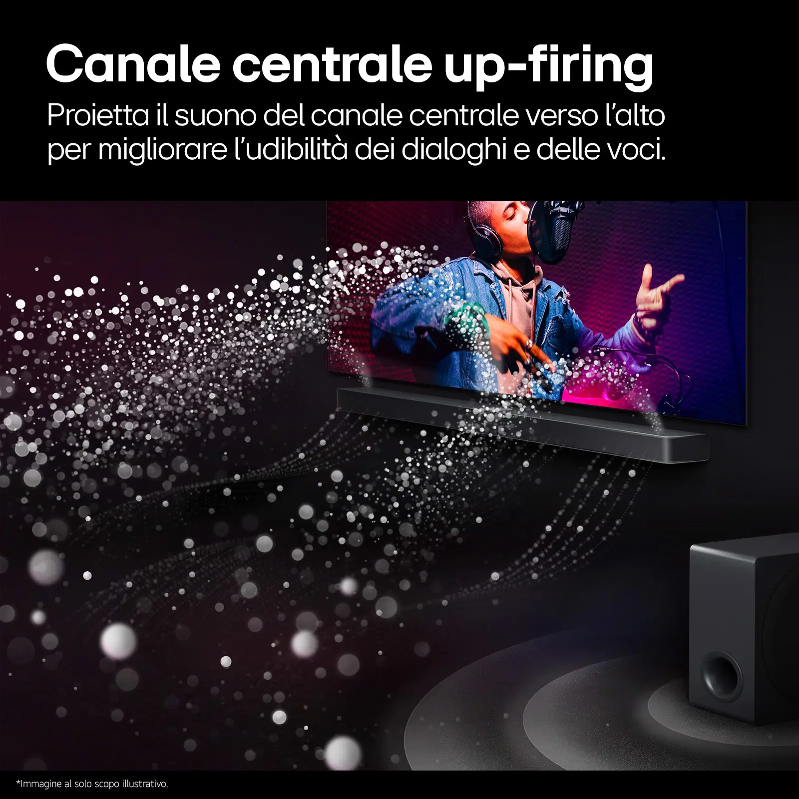 Elabora il suono e ricrea uno strato sonoro aggiuntivo per darti un'esperienza più coinvolgente e ricca di sfumature. Lo strato intermedio viene creato utilizzando gli speaker della soundbar, sintetizzando il suono dei diffusori frontali e di quelli up-firing per creare un campo sonoro addizionale.