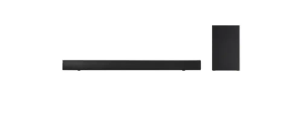 In quanto sistema a 2.1 canali, la soundbar HTB150 vanta due altoparlanti nell'unità principale e un subwoofer wireless per una uscita di potenza totale pari a 100 W. Produce un suono dinamico molto più esteso di quanto possono far pensare le sue dimensioni compatte!