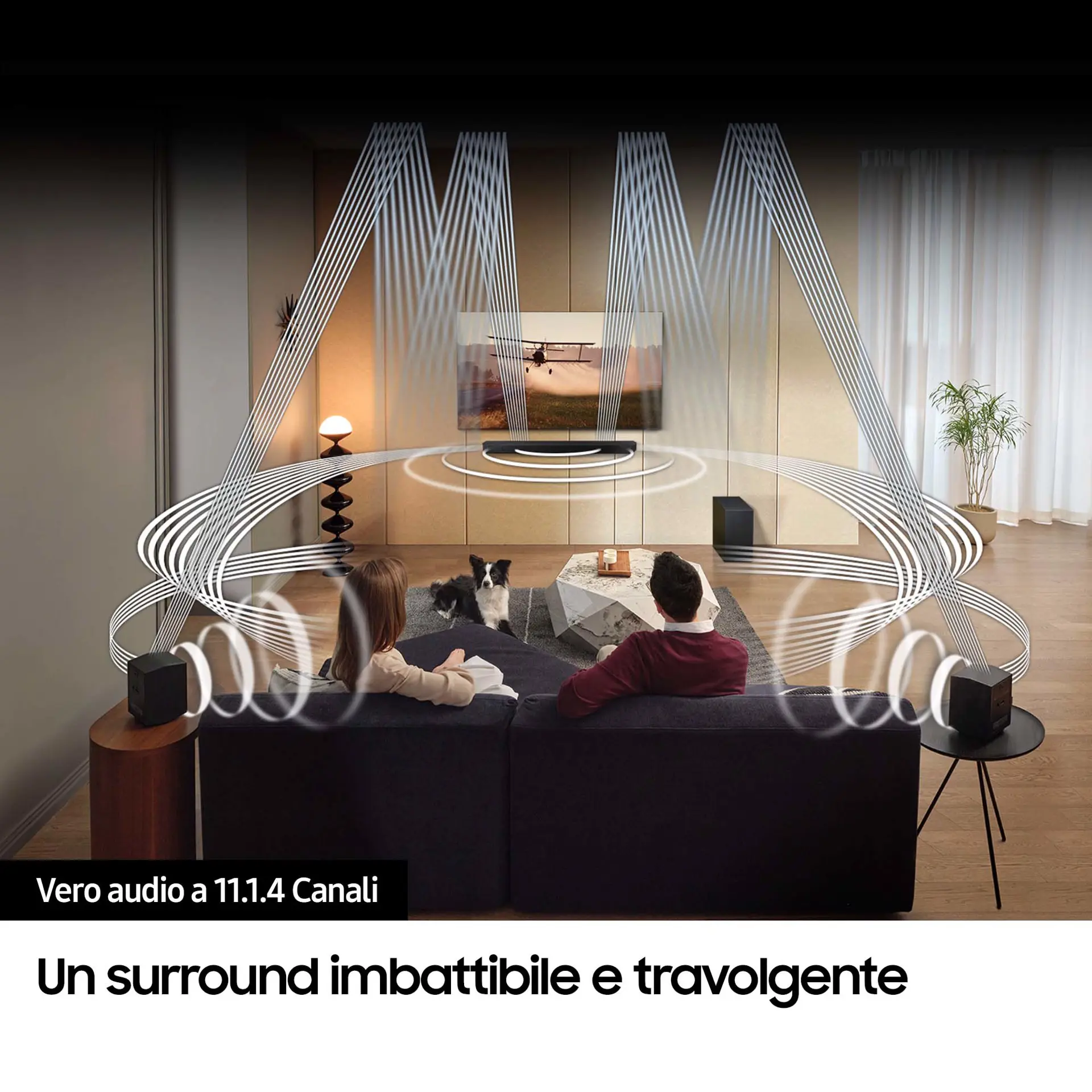 Un sistema pensato per diffondere il suono da ogni angolazione, con 11 canali anteriori e surround, compresi gli altoparlanti posteriori, 1 canale subwoofer e 4 canali con emissione verso lalto, per un'esperienza incredibilmente immersiva.