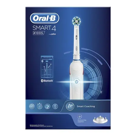 Oral-B Smart 4 4100S. Utilizzo: Adulto, Tipo di spazzolino da denti: Spazzolino rotante-oscillante, Frequenza oscillazioni dello spazzolino: 9900 movimenti per minuto. Alimentazione: Batteria, Tipo batteria: Batteria integrata, Tecnologia batteria: Ioni di Litio. Numero di manici inclusi: 1 pezzo(i), Numero di testine incluse: 2 pezzo(i), Testine per spazzolino incluse: Cross Action