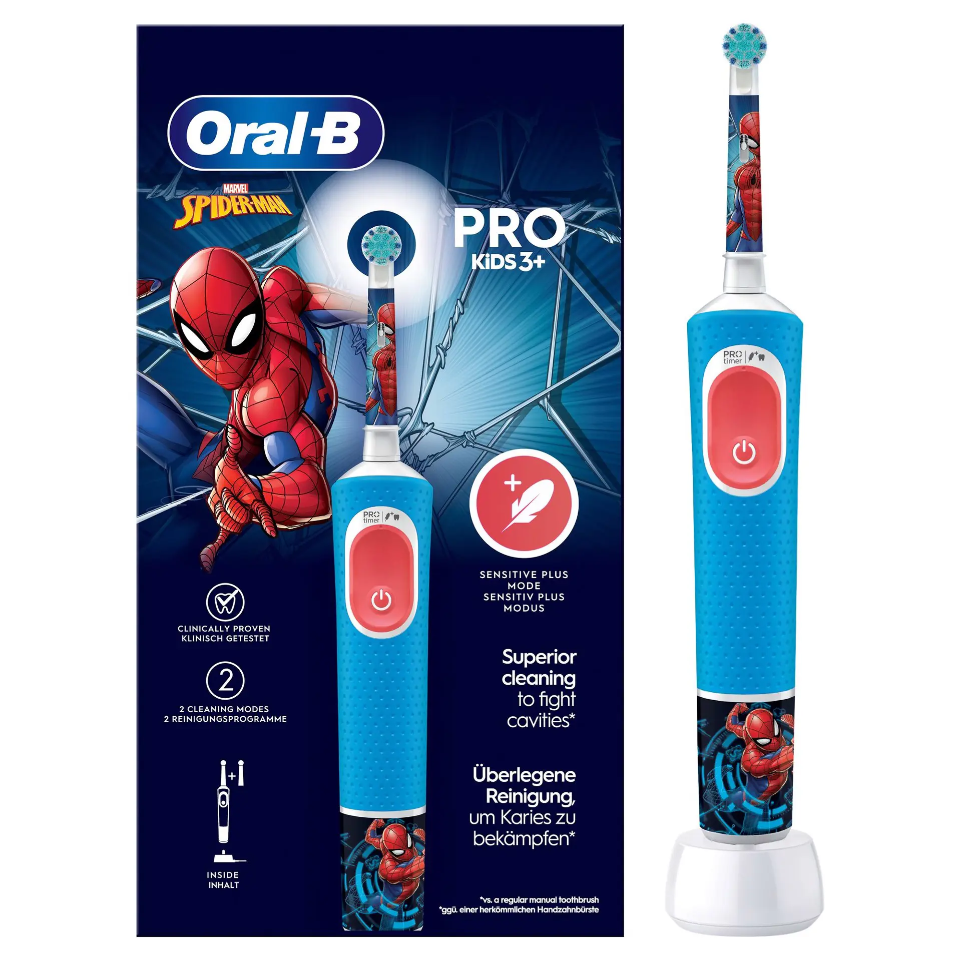 Oral-B Spazzolino Elettrico Ricaricabile Pro Kids con personaggi Marvel Spider-Man, 2 Testine, da 3 Anni In Su. 1 Spazzolino, Bambino, Spazzolino oscillante, Cura quotidiana, Super sensitive, Blu, Bianco, 2 min, 3 anno/i