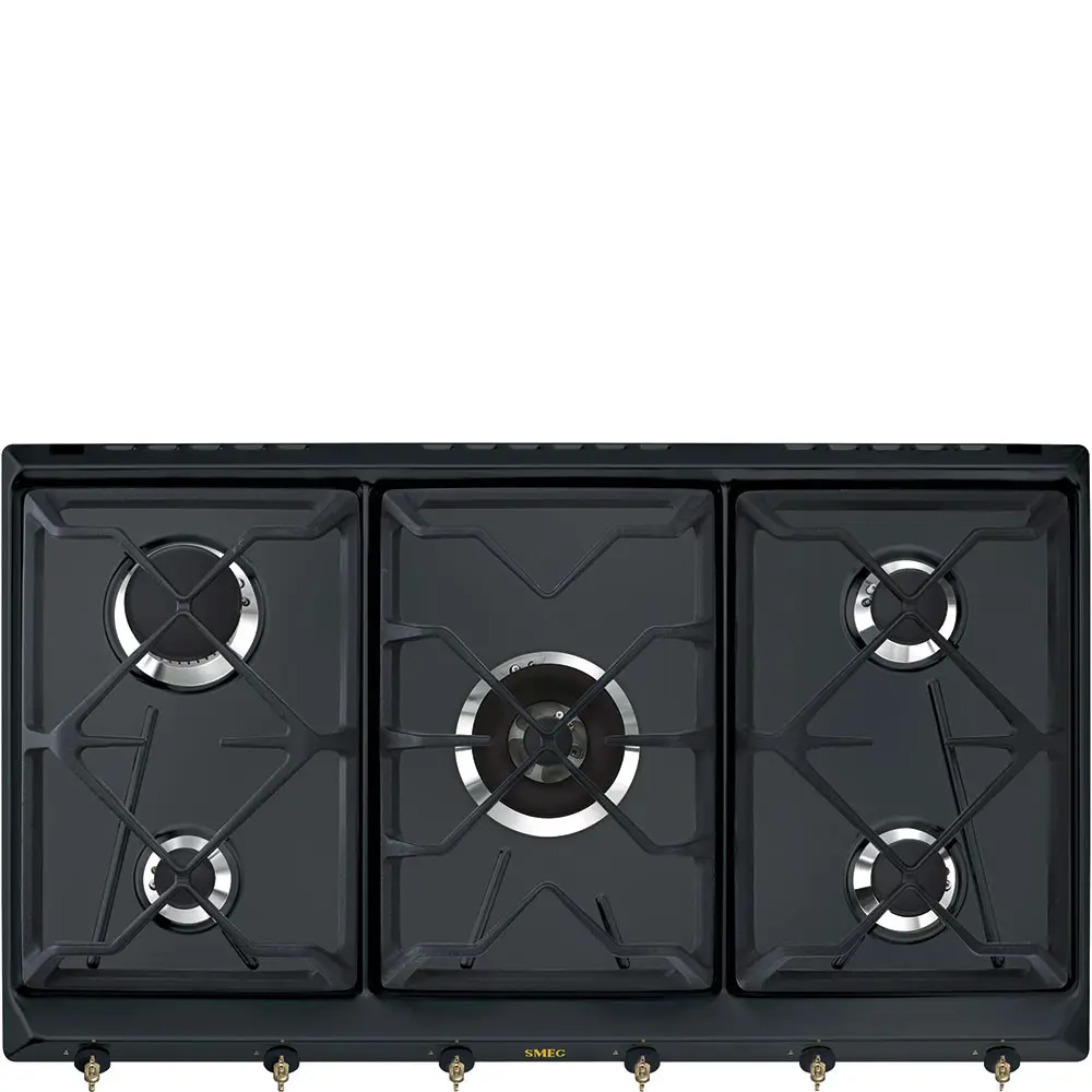 Smeg SRV896AOGH. Colore del prodotto: Antracite, Posizionamento dell'apparecchio: Da incasso, Tipo di piano cottura: Gas. Bruciatore piccolo: 1050 W, Bruciatore medio: 1650 W, Bruciatore grande: 3100 W. Tipo di controllo: Manopola, Posizione di controllo: Frontale superiore. Potenza aggregata (gas): 12400 W, Tensione di ingresso AC: 220-240 V, Frequenza di ingresso AC: 50 - 60 Hz. Larghezza: 885 mm, Profondità: 500 mm, Altezza: 30 mm