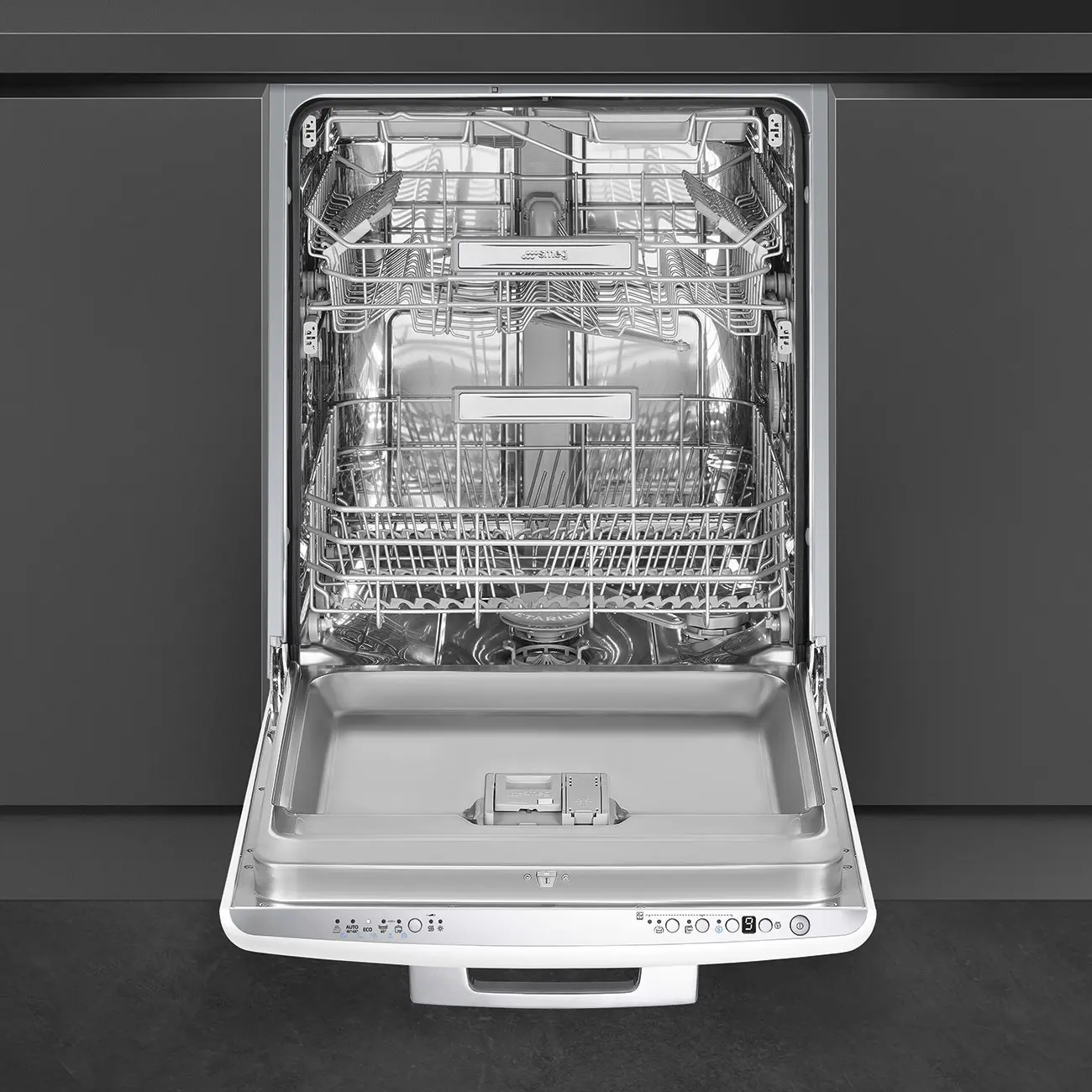 Smeg STFABWH3. Posizionamento dell'apparecchio: A scomparsa totale, Dimensione: Dimensione massima (60 cm), Colore della porta: Bianco. Numero di coperti: 13 coperti, Classe emissione rumore: B, Emissione acustica: 44 dB. Regolazione piedini: 7 cm. Classe efficienza energetica: B, Consumo di acqua per ciclo: 9 L, Consumo energetico per 100 cicli: 63 kWh. Larghezza: 598 mm, Profondità: 584 mm, Altezza: 818 mm