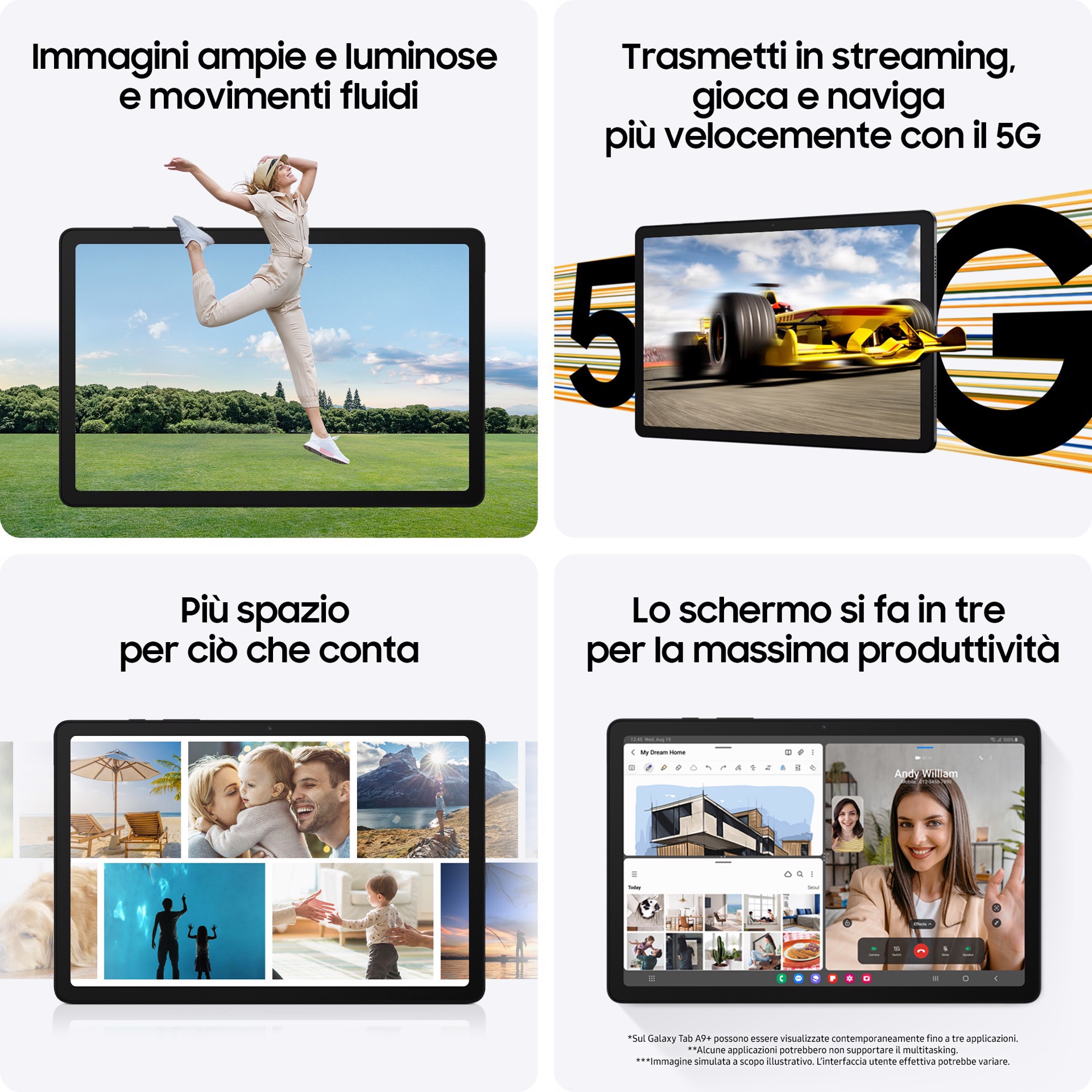 Samsung Galaxy Tab A9+ SM-X210RZAPEUE. Dimensioni diagonale schermo: 27,9 cm (11"), Risoluzione del display: 1920 x 1200 Pixel. Capacità memoria interna: 256 GB. Famiglia processore: Qualcomm Snapdragon, Modello del processore: SM6375. RAM installata: 8 GB. Risoluzione fotocamera posteriore (numerico): 8 MP, Tipo di fotocamera posteriore: Fotocamera singola, Risoluzione fotocamera frontale (numerico): 5 MP. Wi-Fi standard: Wi-Fi 5 (802.11ac). Assistenza funzione GPS (A-GPS). Lettore di schede integrato. Peso: 480 g. Sistema operativo incluso: Android 13. Colore del prodotto: Grafite